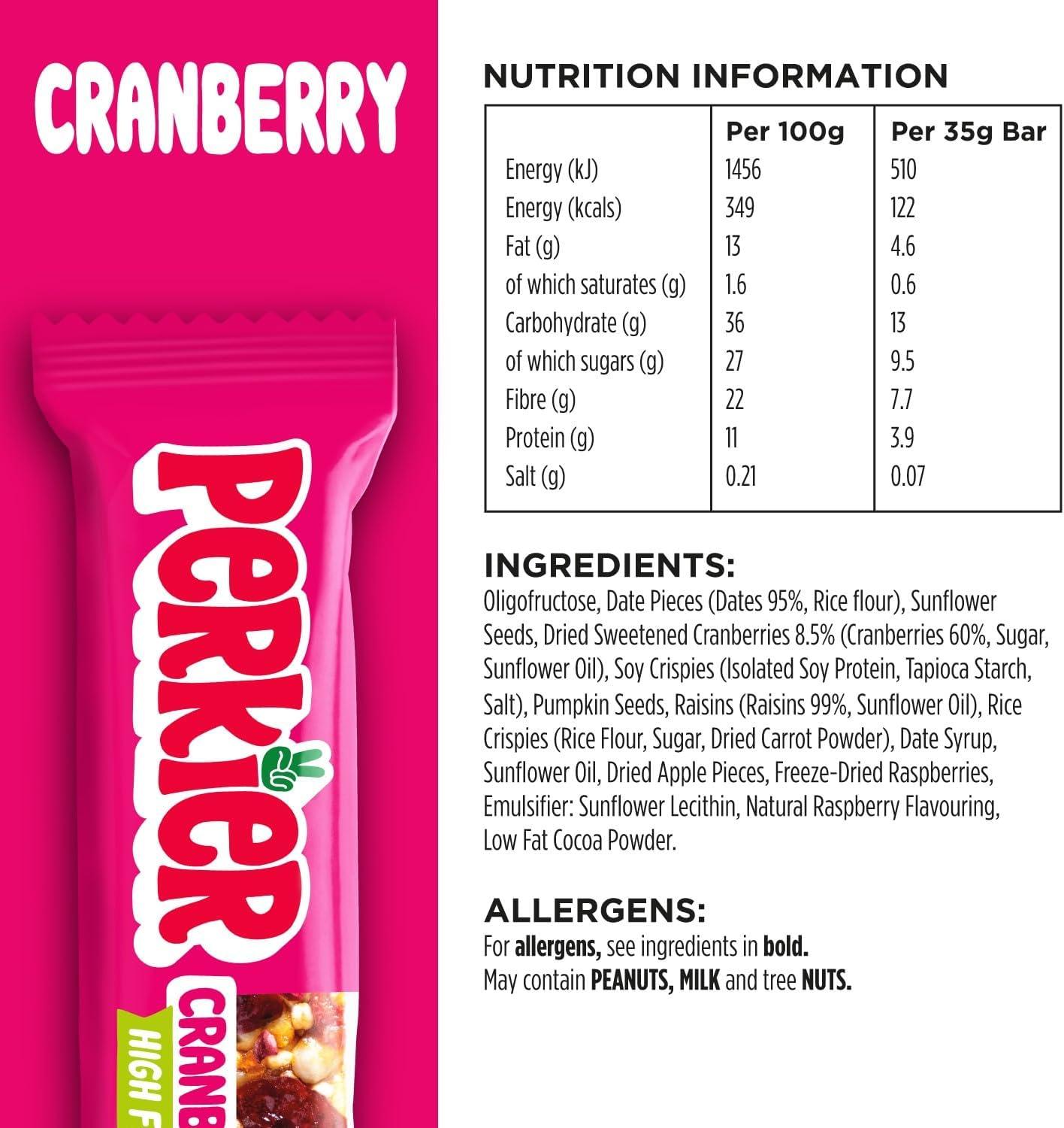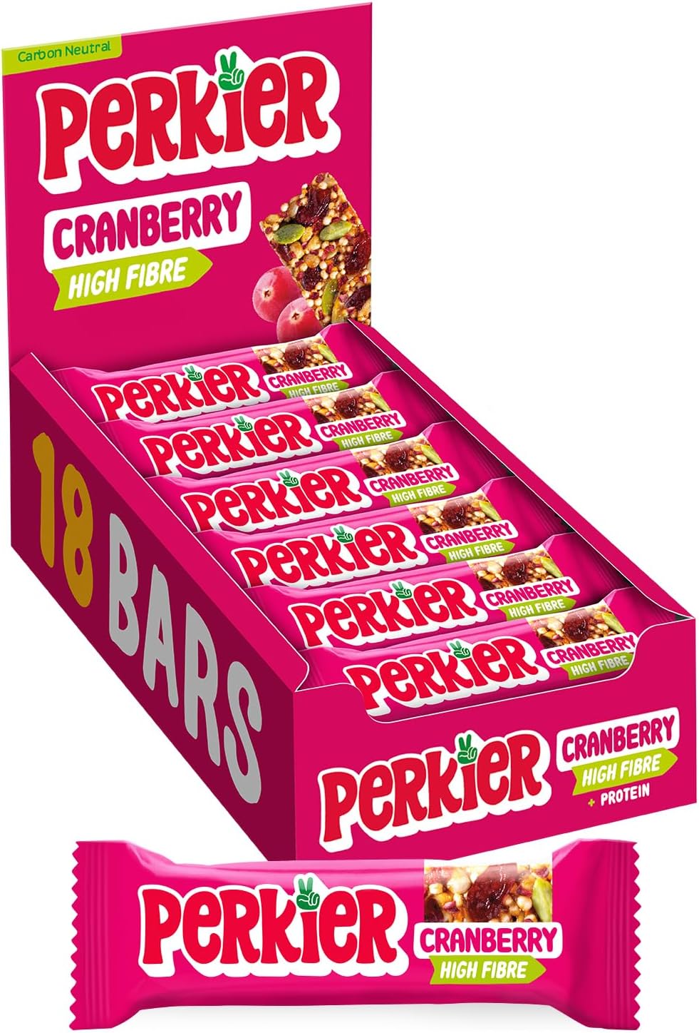 Perkier Cranberry, 18 Bars, Vegan, Gluten Free, Protein, High Fibre, Lower Sugar Snack, Natural Ingredients, Lower Calorie, Healthy, No Palm Oil, Carbon Neutral, Recyclable Packaging