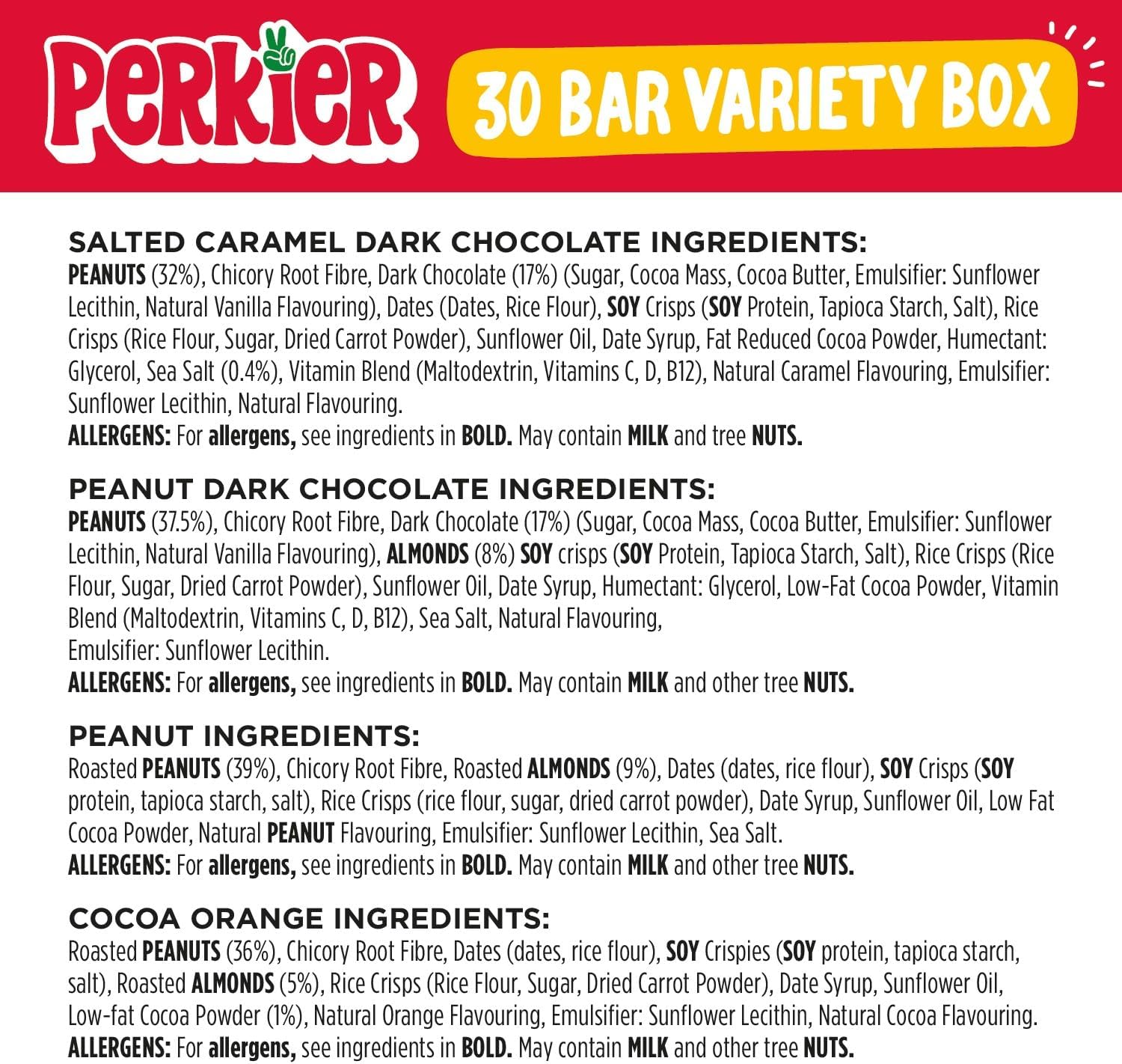 Perkier Variety Box (30 Bars), Vegan, Gluten Free, Protein, Lower Sugar, Healthy Snacks For Adults, Low Calorie, Halal, Breakfast Bar, High Fibre, Nut, Cereal, Gut Health, Multipack, Plant Based