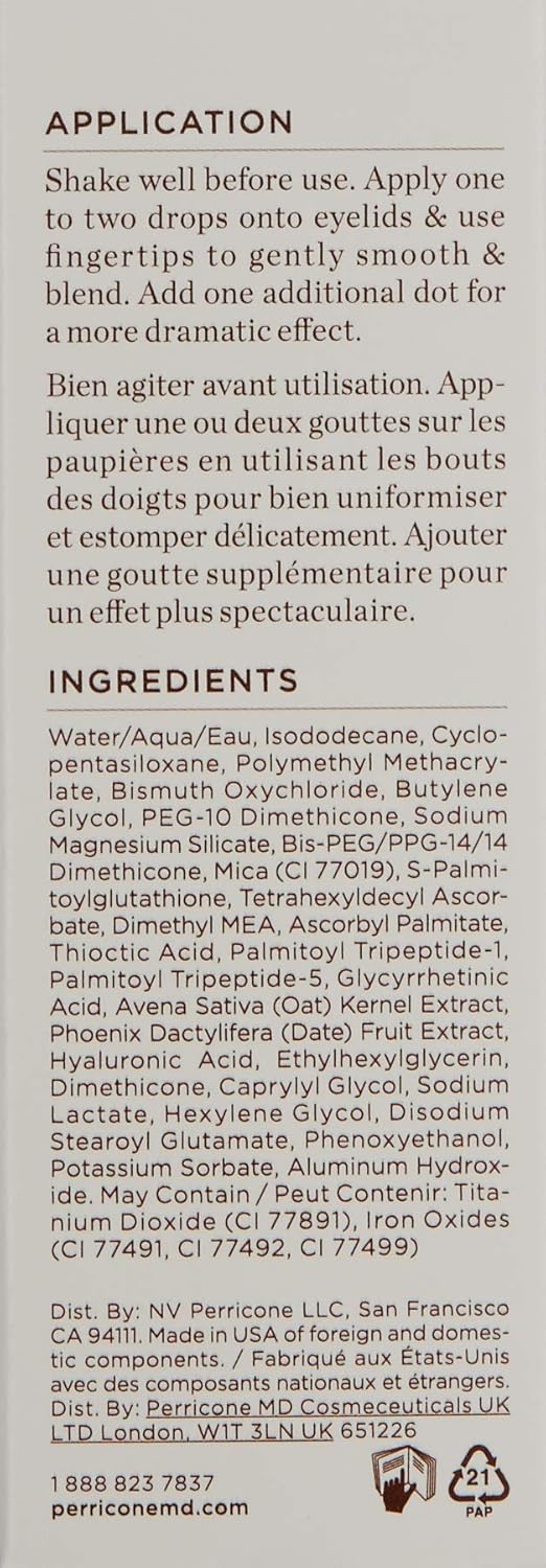 An innovative serum that combines Dr. Perricone's patented skincare technology with cutting edge makeup science. Formulated with Acyl-Glutathione, No Makeup Eyeshadow instantly brightens and awakens the eyes, providing a youthful, natural look to complement any skincare regimen. For more than two decades, Perricone MD has been a holistic, three-tier skincare and wellness system. This consists of diet, essential dietary supplements and potent topical skincare solutions backed by powerful ingredients,Light-reflecting pigments provide a soft, satin finish with pearlized effect,Crease proof and long wearing while delivering anti-aging benefits,Elegant serum texture glides onto eyelids and blends seamlessly providing the perfect amount of coverage