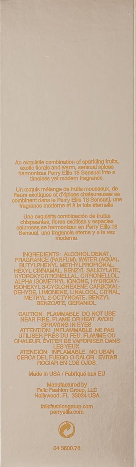 18 sensual Eau De Parfum Spray 3.4 Oz/ 100 Ml for Women by Perry Ellis,All our fragrances are 100% originals by their original designers,This item is by designer Perry Ellis,Due to manufacturer packaging changes, product packaging may vary from image shown,Launched in the year 2008,Classified as a feminine fragrance,Recommended for casual wear