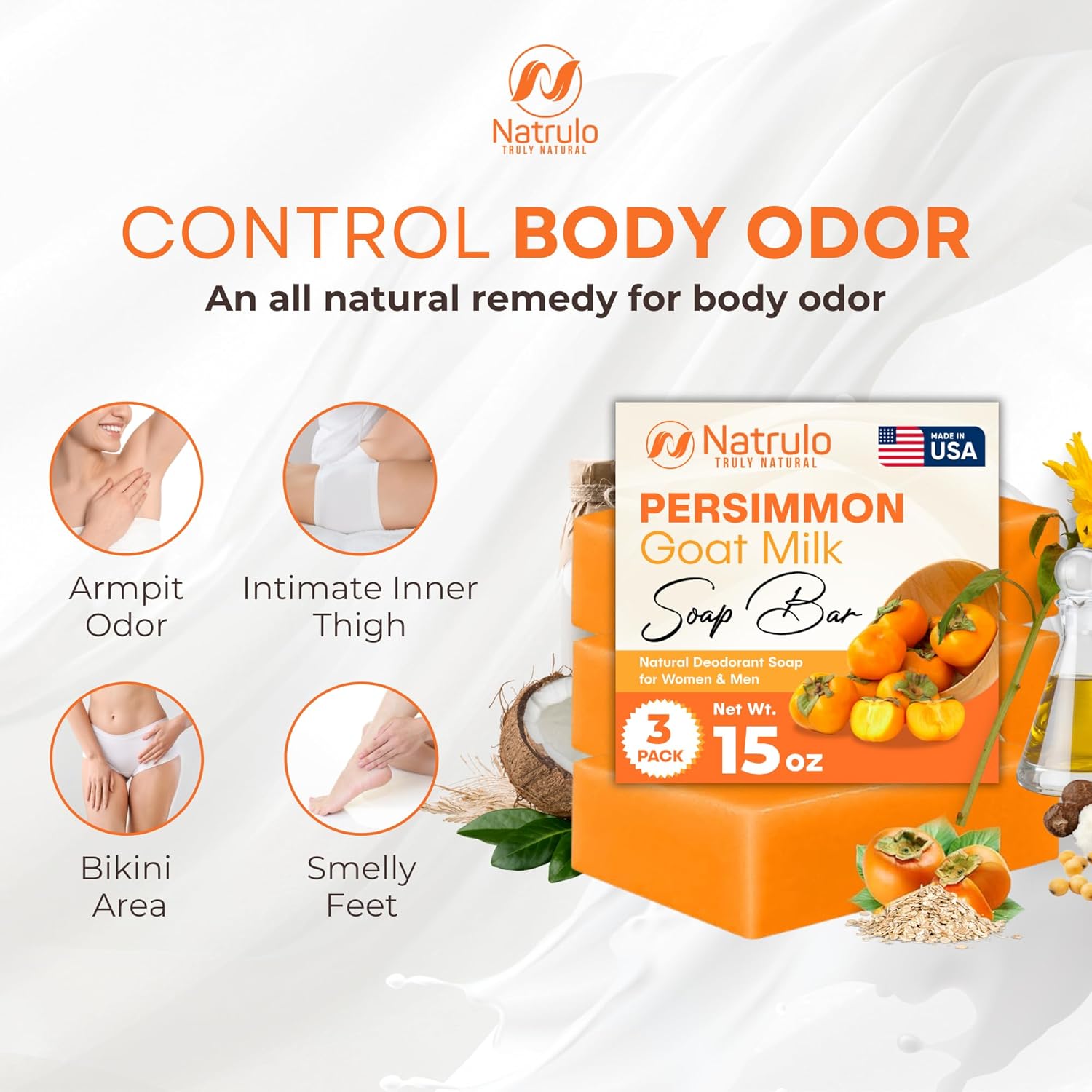 About this item ALL NATURAL ODOR BLOCK WASH: An all-natural remedy for body odor, our persimmon goat milk soap is the best body odor soap for smelly feet, stinky armpits, feminine odor & more. An effective odor blocker, persimmon instantly neutralizes funky smells. SOOTHING + HYDRATING: Enriched with pure essential oils & shea butter, the goat milk body wash goes beyond skin deodorizing. Our purely natural face cleanser also acts as a brightening soap for the body & face. EFFECTIVE, GENTLE-ON SKIN: Consisting of a goat milk base, the face & body wash bar leaves skin moisturized, soft, soothed & supple. Unlike other deodorant soaps for body odor, this deodorizing soap with persimmon is non-drying. SOAP BAR FOR MEN, WOMEN, & KIDS: Use our deodorant soap for kids, older adults or stinky teenagers! Made out of earth’s purest oils & extracts, the odor-eliminating soap bar gently exfoliates, brightens the complexion & combats foul B.O. HANDCRAFTED SKINCARE MADE IN USA: Our artisanal soap bars are all proudly handcrafted here in America. Know you’re getting the finest quality available. Trust Natrulo for all of your natural skincare remedies & solutions. Click ADD TO CART now! See more product details,ALL NATURAL ODOR BLOCK WASH: An all-natural remedy for body odor, our persimmon goat milk soap is the best body odor soap for smelly feet, stinky armpits, feminine odor & more. An effective odor blocker, persimmon instantly neutralizes funky smells,SOOTHING + HYDRATING: Enriched with pure essential oils & shea butter, the goat milk body wash goes beyond skin deodorizing. Our purely natural face cleanser also acts as a brightening soap for the body & face,EFFECTIVE, GENTLE-ON SKIN: Consisting of a goat milk base, the face & body wash bar leaves skin moisturized, soft, soothed & supple. Unlike other deodorant soaps for body odor, this deodorizing soap with persimmon is non-drying,SOAP BAR FOR MEN, WOMEN, & KIDS: Use our deodorant soap for kids, older adults or stinky teenagers! Made out of earth’s purest oils & extracts, the odor-eliminating soap bar gently exfoliates, brightens the complexion & combats foul B.O,HANDCRAFTED SKINCARE MADE IN USA: Our artisanal soap bars are all proudly handcrafted here in America. Know you’re getting the finest quality available. Trust Natrulo for all of your natural skincare remedies & solutions. Click ADD TO CART now!