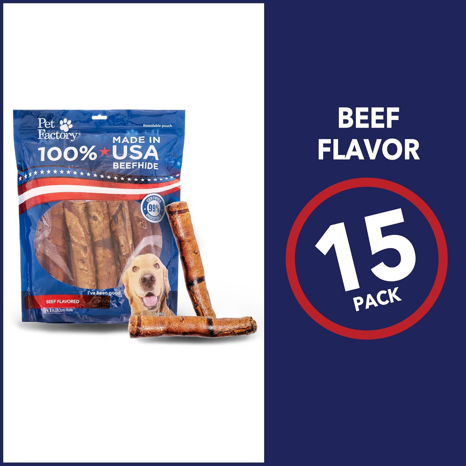 Pet Factory 100% Made In Usa Beefhide 8" Rolls Dog Chew Treats - Beef Flavor, 15 Count/1 Pack