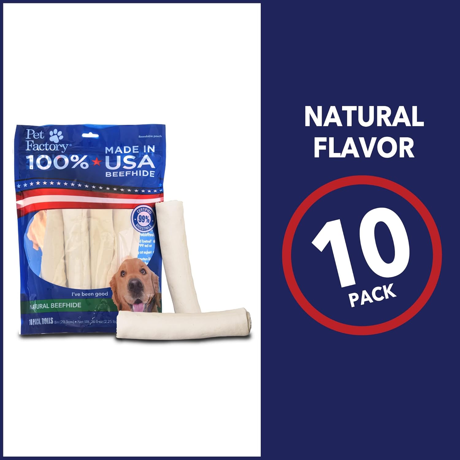 Pet Factory 100% Made In Usa Beefhide 8" Rolls Dog Chew Treats - Natural Flavor, 10 Count/1 Pack