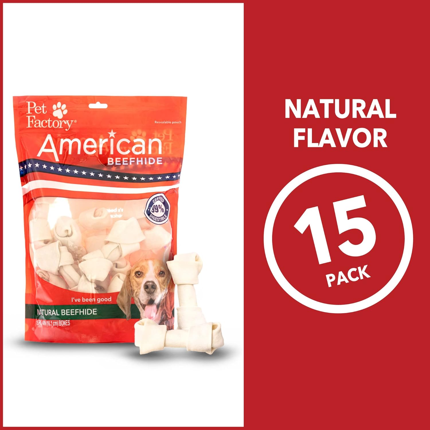 Pet Factory American Beefhide 4-5" Knotted Bones Dog Chew Treats - Natural Flavor, 15 Count/1 Pack