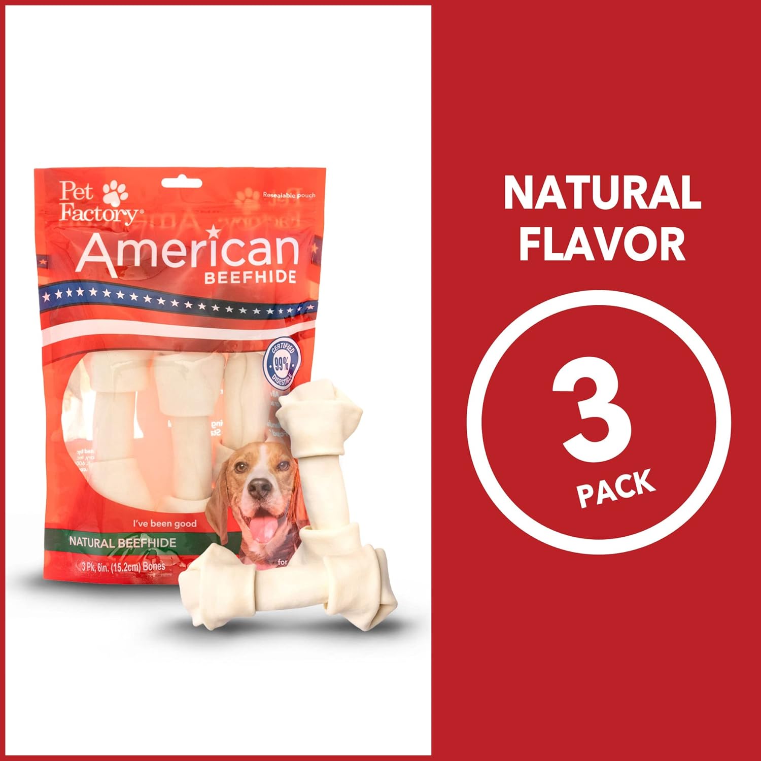 Pet Factory American Beefhide 6-7" Knotted Bones Dog Chew Treats - Natural Flavor, 3 Count/1 Pack