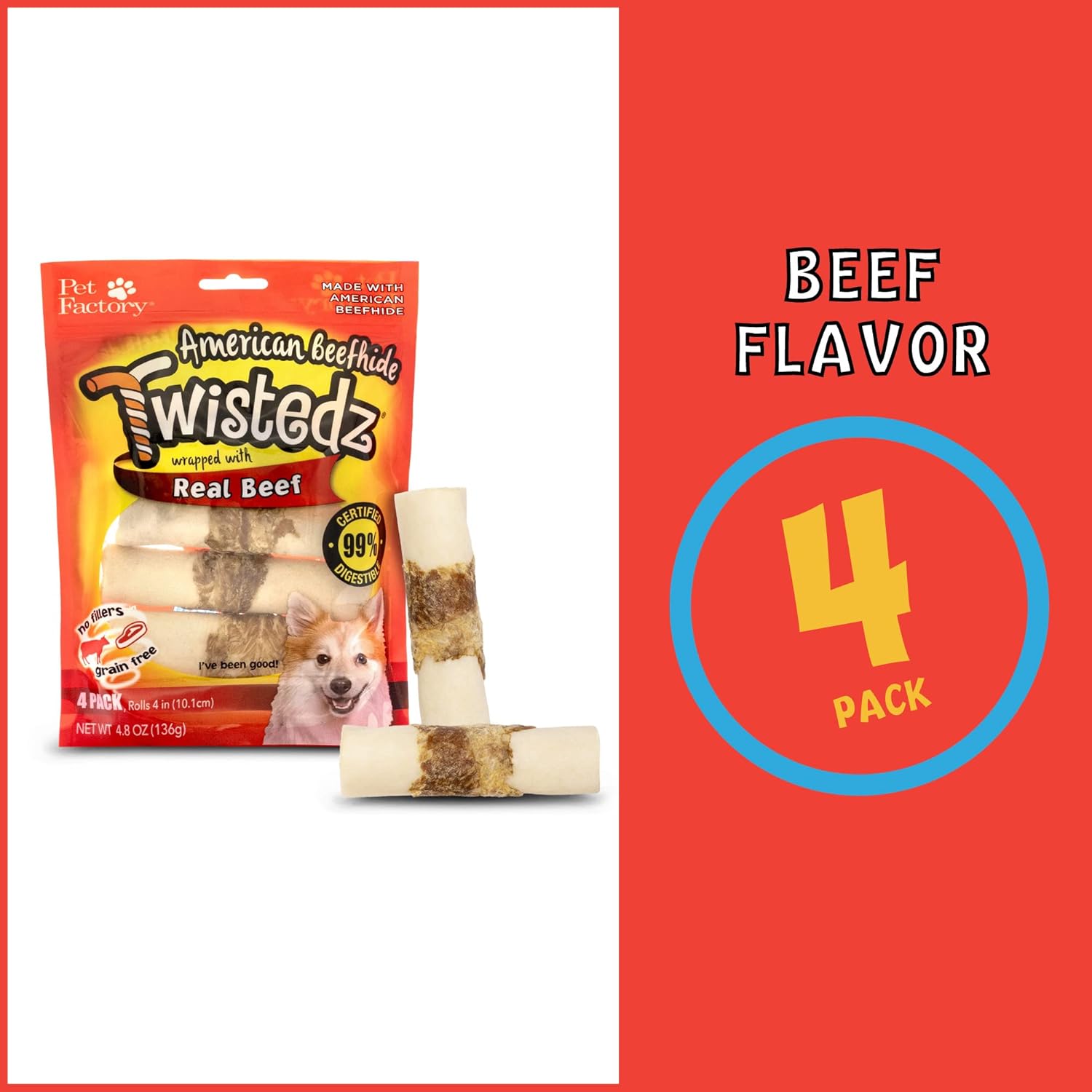 Pet Factory Twistedz American Beefhide 4" Rolls Dog Chew Treats W/ Real Beef Meat Wrap - 4 Count/1 Pack