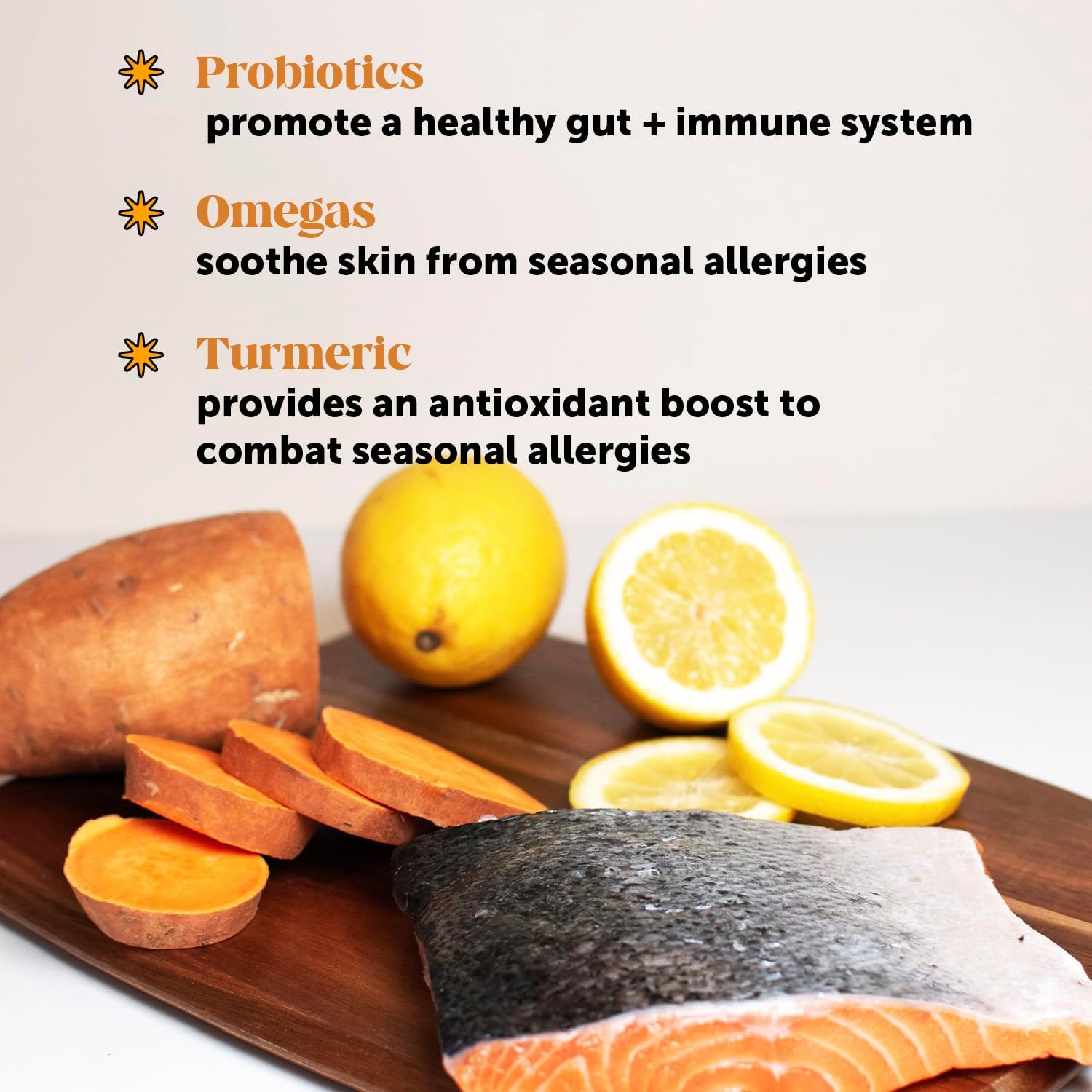 Soothes Skin-Related Issues Associated With Seasonal Allergies - Our Allergy Chews Include Natural Wild Alaskan Salmon Oil Which Contain Healthy Omega-3 Fatty Acids To Support A Healthy Immune System And Skin Health