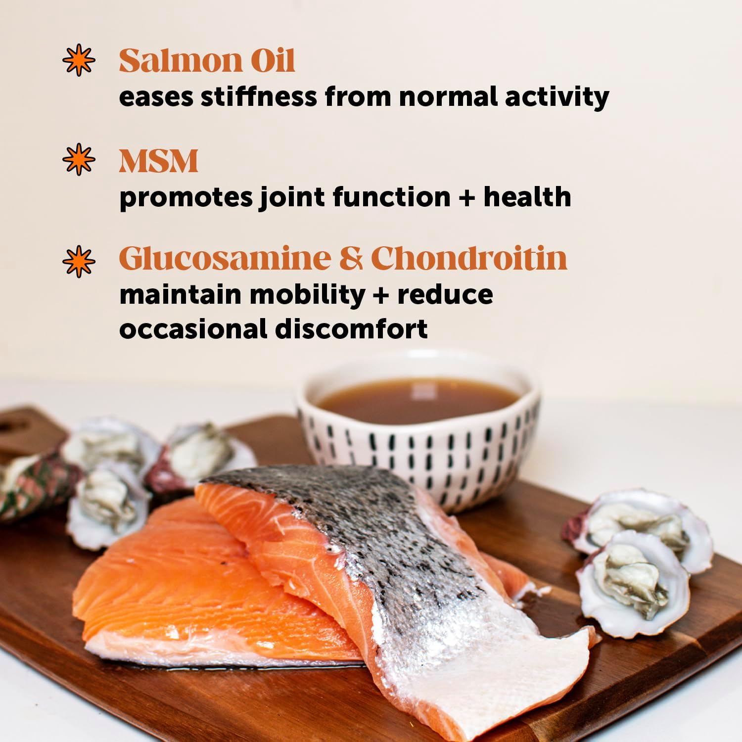 Made With Natural Ingredients Like Salmon Oil, Glucosamine + Chondroitin, & More: For Your Pup’S Wellness, We Use Natural Ingredients That Truly Work. Omega-Rich Salmon Oil Enhances Mobility, While Glucosamine And Chondroitin Support Joint Health And Flexibility. Msm Aids In Joint Function, And Fish Oil Benefits Joints, Skin, Brain, Heart, And Overall Health. Collagen-Rich Bone Broth Adds A Protein Boost
