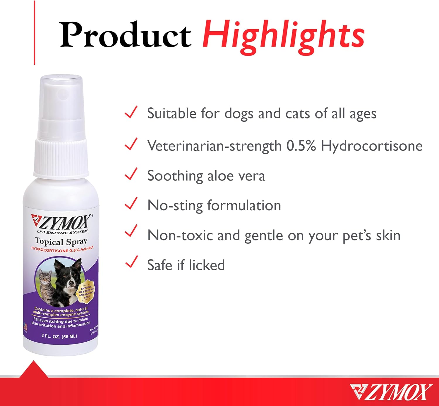 Veterinarians And Pet Parents Alike Have Been Using Zymox Products To Successfully Manage PetāS Ear Infections And Irritated Skin For More Than 20 Years. The Zymox Range Of Pet Products Includes: Pet Ear Cleaners Shampoos Leave-In Coat Conditioners Topical Creams Hot Spot Sprays Together, They Can Soothe Your Petsā Ear And Skin Problems. Zymox Products Help Manage The Symptoms Of Fungal And Yeast Infections Without Using Harsh Chemical Ingredients. Zymox Hot Spot Spray For Dogs And Cats Promotes Relief From Itching, Allergies And Hot Spots . It Contains 0.5% Hydrocortisone To Calm Irritated Skin And Aloe Vera To Soothe Redness And Inflammation . Our Anti-Itch Spray For Dogs And Cats Also Soothes Skin Wounds And Infections . The No-Sting Formula With The Zymox Patented Lp3 Enzyme System Aids Recovery From Skin Infections Caused By Germs, Fungi And Yeast . Zymox Spray Is Ideal For Use On: Skin Bumps And Pustules Red, Irritated Or Inflamed Skin Itchy Skin Red, Discoloured Paws, Irritated By Licking Red, Bald Patches, Often Irritated By Licking Wounds And Cuts Infected Skin Hot Spots Zymox Spray Is Simple To Use - Spray Onto The Affected Area Once Or Twice A Day, For Up To Seven Days. ThereāS No Need To Further Upset Your Pet By Cleaning Their Painful, Irritated Skin Beforehand, Just Spray The Area For Effective Relief. Because Zymox Hot Spot Spray For Dogs And Cats Only Contains Safe, Gentle And Non-Toxic Ingredients, ItāS Safe If Your Inquisitive Pet Licks The Application Site . Recurrent Skin Infections, Hot Spots And Irritation Can Lead To A Distressed Pet And Repeat Visits To Your Veterinarian. They Can Also Mean Repeat Courses Of Medication, Which Can Lead To Problems With Resistant Bugs That DonāT Respond To Conventional Treatment. The Zymox Patented Lp3 Enzyme System Is Effective On A Broad Spectrum Of Germs, Fungi And Yeasts That Cause Skin Problems. Enzymes Are Naturally-Occurring Proteins, And The Lp3 Enzyme System From Zymox Helps Destroy Microorganisms Without Attacking Healthy Cells Or Irritating The Skin . Enzymes DonāT Develop A Resistance To Microbes And Will Continue To Work For Your Pet When They Need Them. ThereāS No Need To Pre-Clean Sore Areas First. Simply Spray Without Cleaning. The Enzymes React With Organic Matter Within The Skin Helping To Manage Infections And Hot Spots. Zymox Topical Spray Includes 0.5% Hydrocortisone For Relief From Itching And Inflammation . Zymox Topical Spray Is An All-In-One Solution For Infections Caused By Germs, Fungi And Yeast . The Lp3 Enzyme System Reacts With Biological Materials In The Skin To Form Its Powerful Properties. Simple, Effective Relief. Apply Once Or Twice A Day By Spraying The Entire Affected Area. ThereāS No Need To Cause Fear Or Upset In Your Pet, As ThereāS No Painful Pre-Cleaning Necessary . Pre-Cleaning And Cleaning During Use Disrupts The Biological System And Will Negatively Affect Results. Ear Solution W/ Hc Ear Solution Ear Cleanser Topical Spray W/ Hc Shampoo Leave-On Conditioner Add To Cart Add To Cart Add To Cart Add To Cart Add To Cart Add To Cart Customer Reviews .Aplus-V2 .Aplus-Review-Right-Padding { Padding-Right: 0.1Rem; } 4.7 Out Of 5 Stars 14,119 .Aplus-V2 .Aplus-Review-Right-Padding { Padding-Right: 0.1Rem; } 4.6 Out Of 5 Stars 1,187 .Aplus-V2 .Aplus-Review-Right-Padding { Padding-Right: 0.1Rem; } 4.6 Out Of 5 Stars 5,502 .Aplus-V2 .Aplus-Review-Right-Padding { Padding-Right: 0.1Rem; } 4.4 Out Of 5 Stars 3,183 .Aplus-V2 .Aplus-Review-Right-Padding { Padding-Right: 0.1Rem; } 4.7 Out Of 5 Stars 1,827 .Aplus-V2 .Aplus-Review-Right-Padding { Padding-Right: 0.1Rem; } 4.7 Out Of 5 Stars 1,290 Price $22.49 $ 22 . 49 $19.49 $ 19 . 49 $15.99 $ 15 . 99 $16.99 $ 16 . 99 $14.99 $ 14 . 99 $14.99 $ 14 . 99 Form Liquid Liquid Liquid Spray Liquid Liquid Contains Hydrocortisone Yes No No Yes No No Size 1.25Oz 1.25Oz 4Oz 2Oz 12Oz / 1 Gallon 12Oz / 1 Gallon Ideal For Infected Ears That Itch Infected Ears That Itch Dirty, Smelly Ears And After A Course Of Ear Solution Hot Spots, Irritated, Inflamed, Itchy Skin Irritated, Inflamed, Or Itchy Skin Irritated, Inflamed, Or Itchy Skin Usage Apply Once Daily For 7 Days Apply Once Daily For 7 Days Use 1 To 2 Times Weekly Or As Directed By A Veterinarian Apply 1 To 2 Times Per Day For 7 Days Use Once Weekly Or As Directed By A Veterinarian Use Once Weekly Or As Directed By A Veterinarian