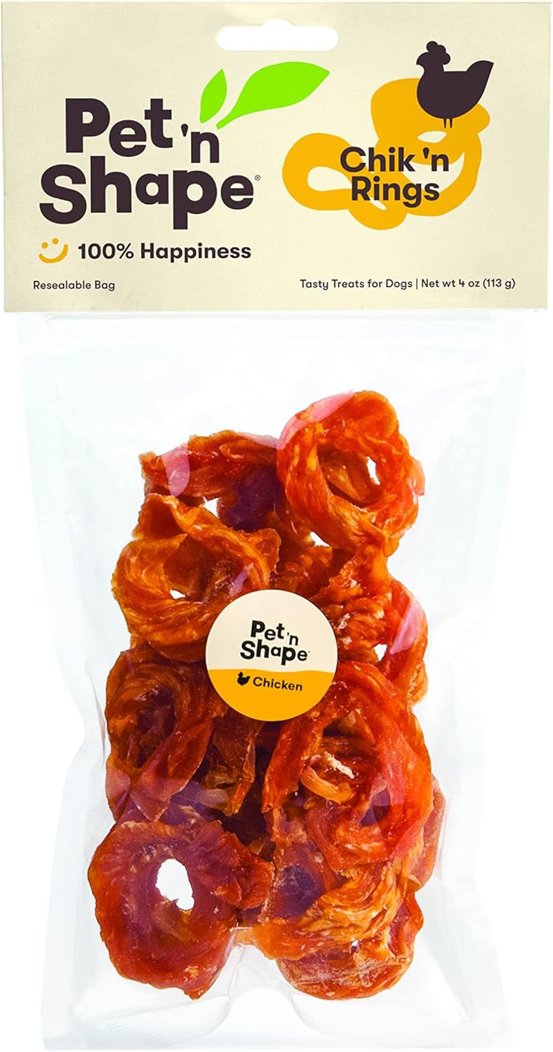 GRAIN FREE - Pet 'n Shape natural Chik 'n Rings are made from 100% all-natural chicken breast formed in a mouth-watering ring shape. Pet 'n Shape treats contain no artificial additivities, colors, or preservatives and contain no wheat, corn, and soy.