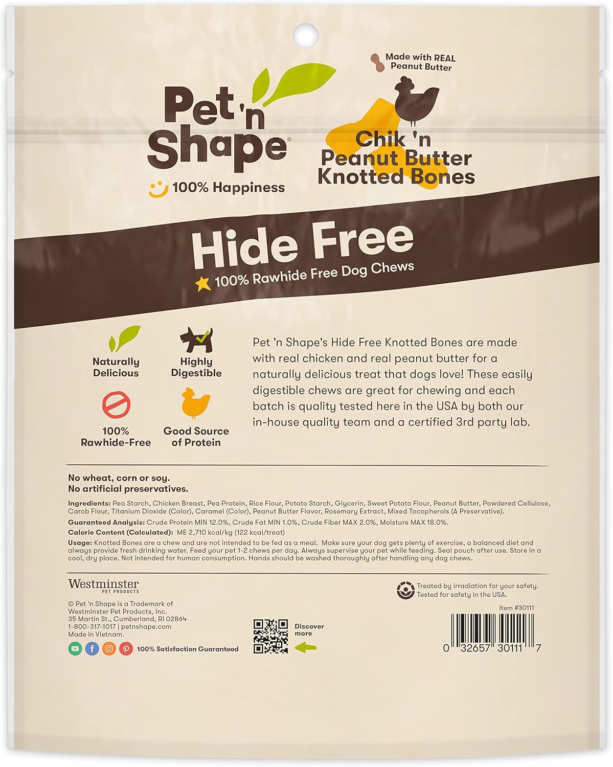Treat Your Furry Family Member To A Hide Free Chew Built For Taste With Pet 'N Shape Hide-Free Two-Tone Chik 'N Knot Bones With Real Peanut Butter Dog Treats! These Naturally Delicious Treats Are Individually Knotted And Are Made With Real Chicken And Peanut Butter. Each Treat Is Designed To Give Your Pup More Of What You Want And Less Of What You Don'T, These Chews Don’T Contain Preservatives Or Grains