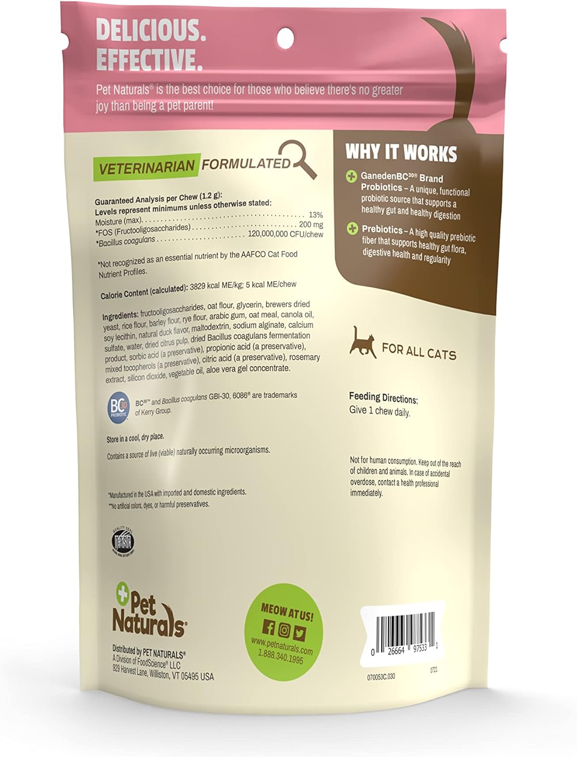 Daily Probiotic For Cats From Pet Naturals Is The Right Combination Of Prebiotics And Probiotics To Support Digestive Regularity, Less Gas And Bloating While Supporting Superior Immune Health. This Daily Probiotic Contains 100 Million CfuāS Of Highly Stable Bacillus Coagulans And 200 Mg Of Fos Fiber - All Delivered In A Tasty Duck-Flavored Chew. Daily Probiotic Is A Great Addition To A Daily Health Regimen But Can Also Be Helpful In Times Of Stress, Like Illness, Boarding Or Travel. All Pet NaturalāS Of Vermont Products Are Veterinarian Formulated And Nasc Approved