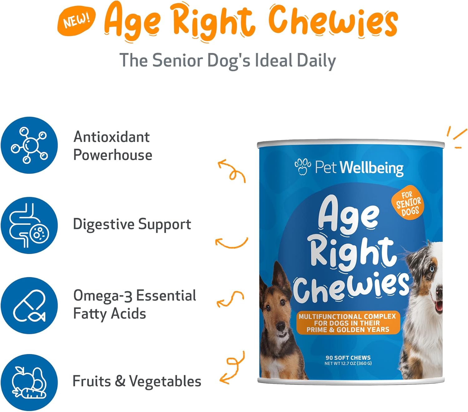 Pet Wellbeing Age Right Chewies For Dogs In Their Prime & Senior Years - Vet-Formulated - Daily Multifunctional Support For Joint Mobility, Immune, Heart Health, Shiny Coat, Energy - 90 Soft Chews