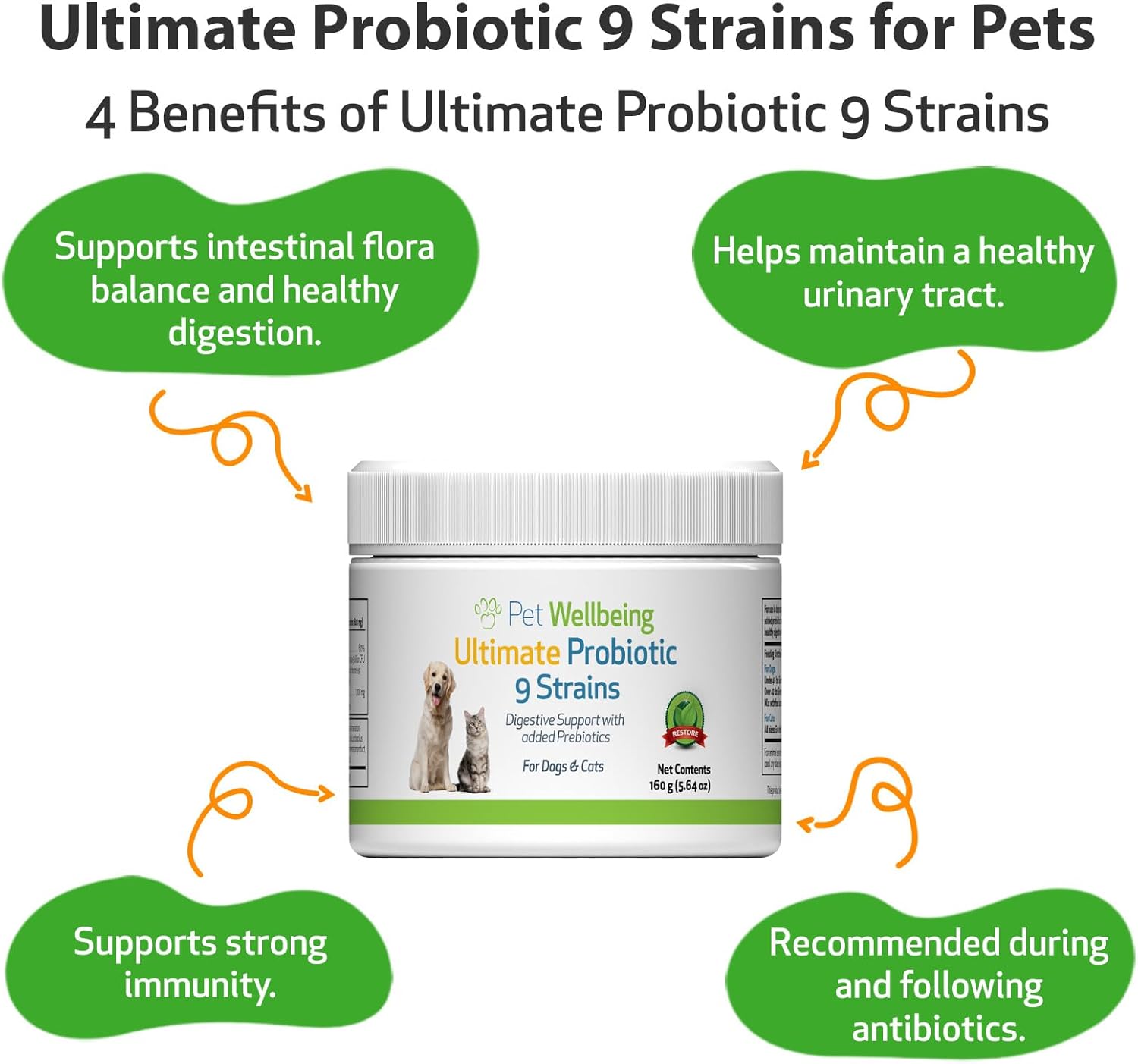 Pet Wellbeing - Ultimate Probiotic 9 Strains For Cats And Dogs - Natural Support For Digestion And Urinary Tract Health 160 Grams