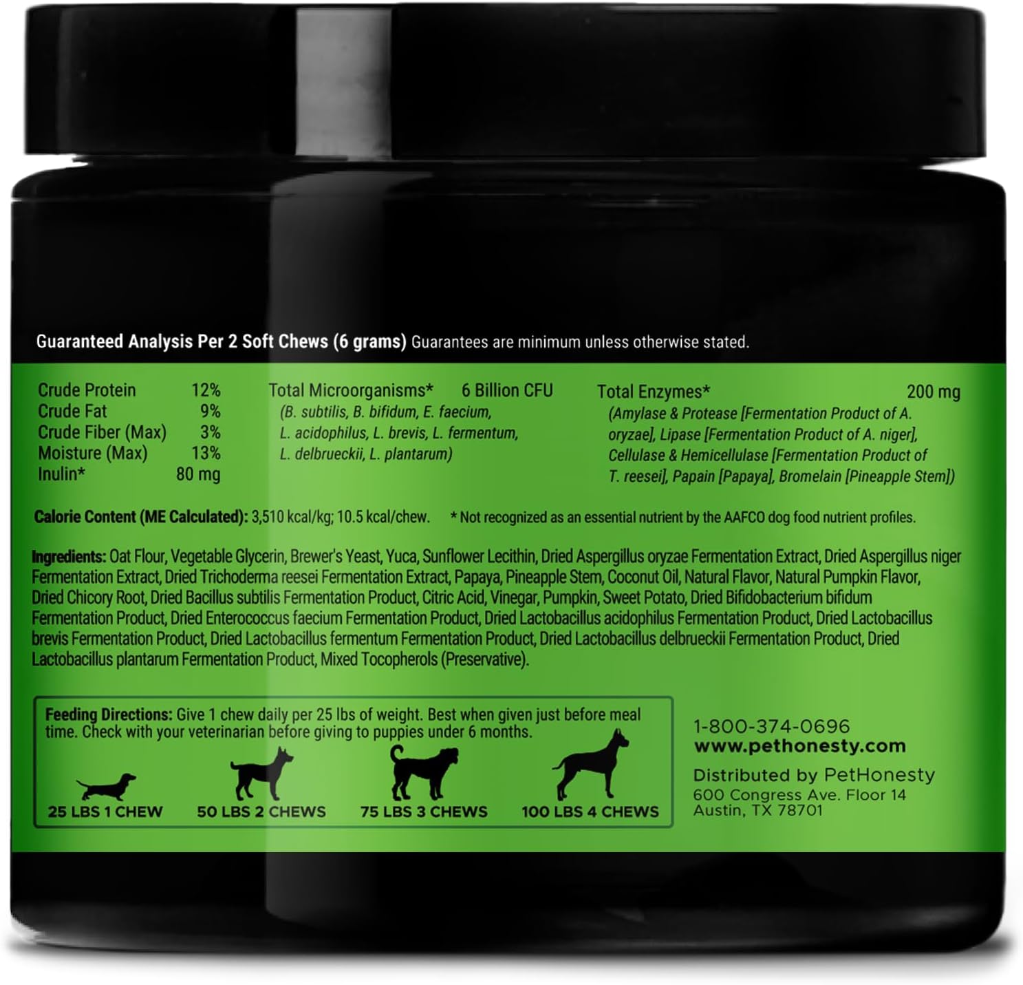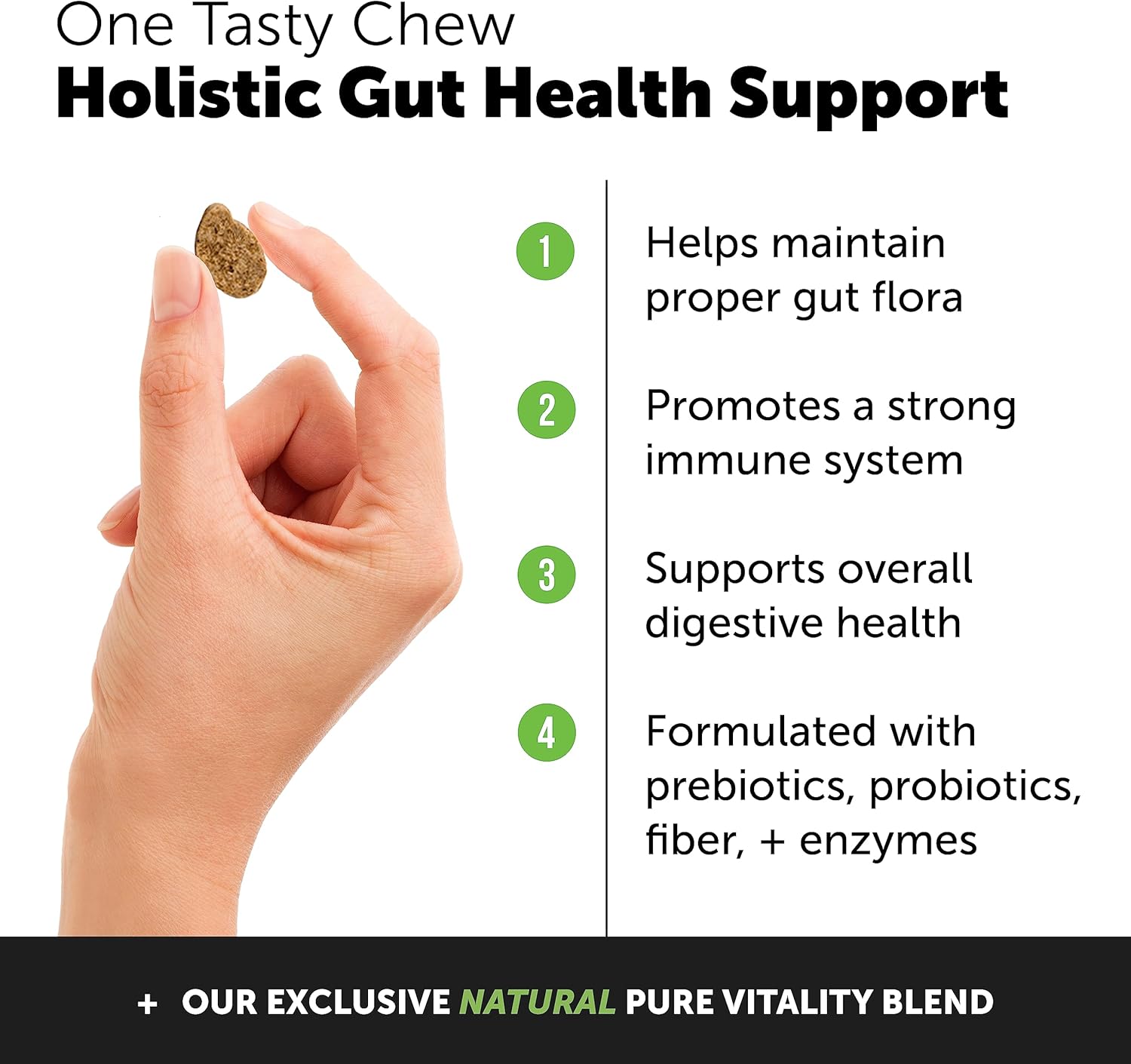 VET-RECOMMENDED TO SOOTHE TUMMY TROUBLES, SUPPORT GUT HEALTH, & MORE: These soft chews contain powerful ingredients like probiotics, chicory root, & digestive enzymes to support beneficial bacteria in the gut & address imbalances that can contribute to digestive upsets. Since 70% of your dog’s immune system lives in their gut, they promote a stronger immune response too! This effective formula also helps soothe sensitive skin and supports a healthy coat