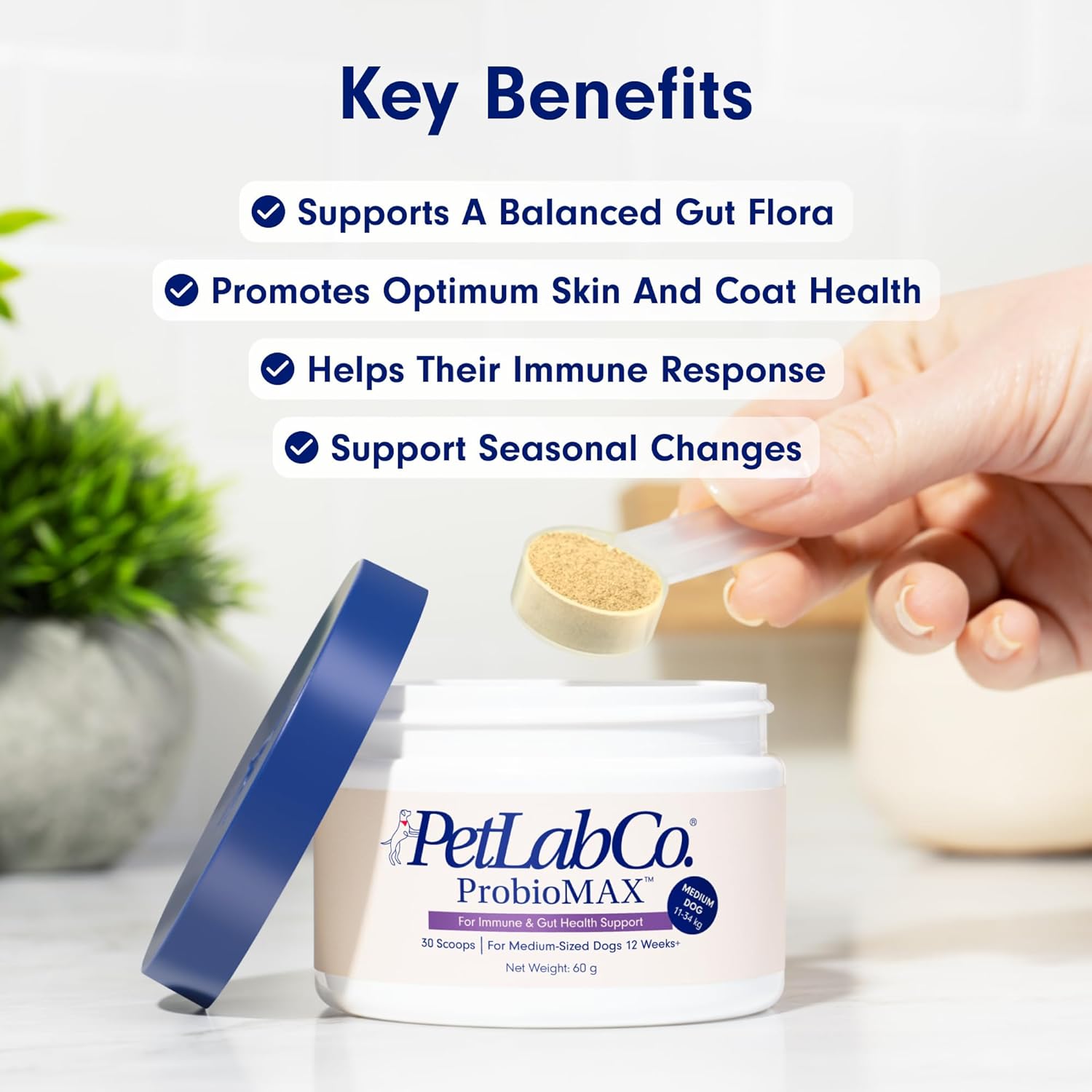 Maintain a healthy gut - Help support gut flora and help maintain a normal immune response. Our probiotic powder comes in three convenient sizes—small, medium, and large—to suit your dog's individual needs. It's incredibly easy to use; just one scoop a day to unleash the best benefits!