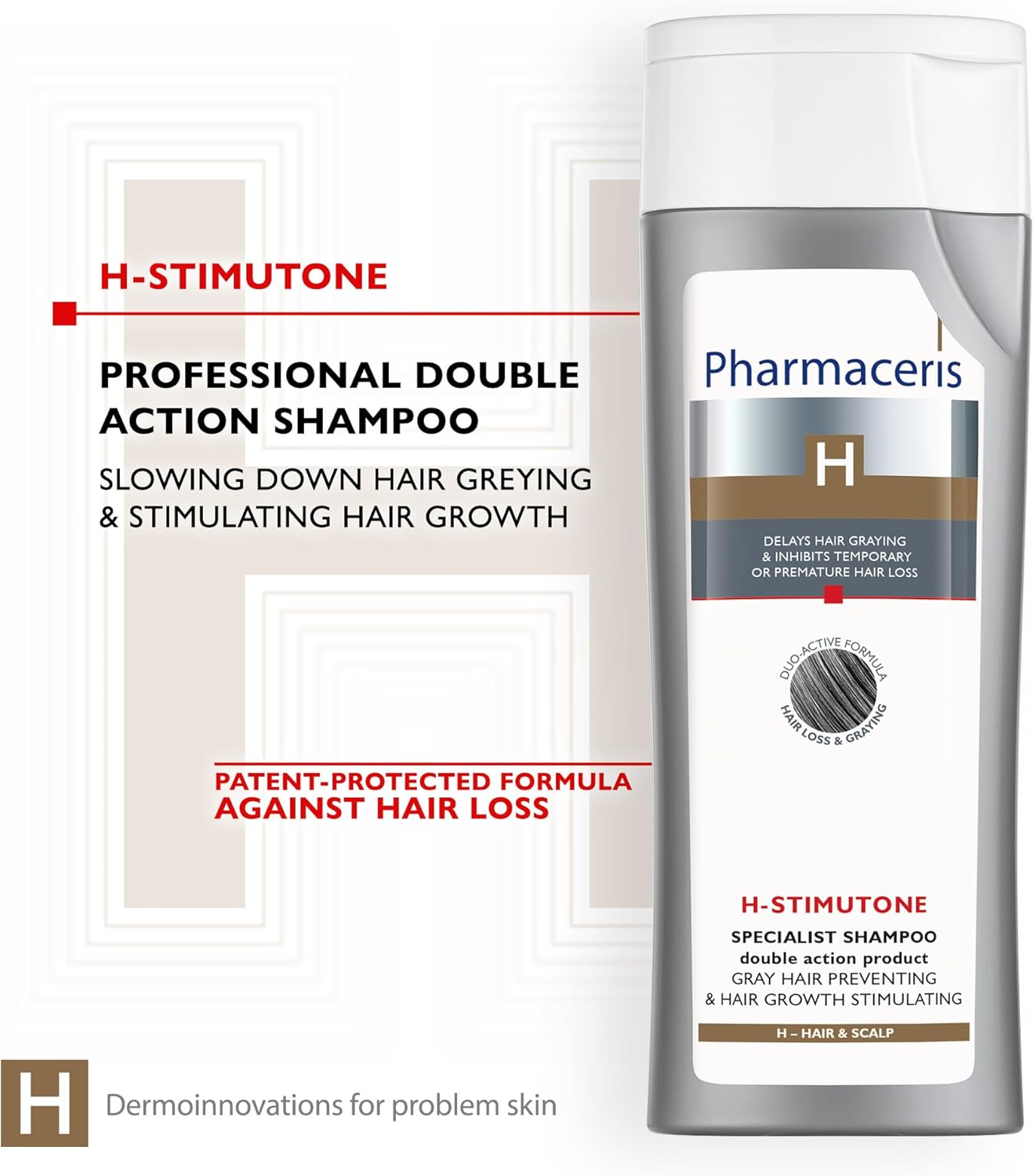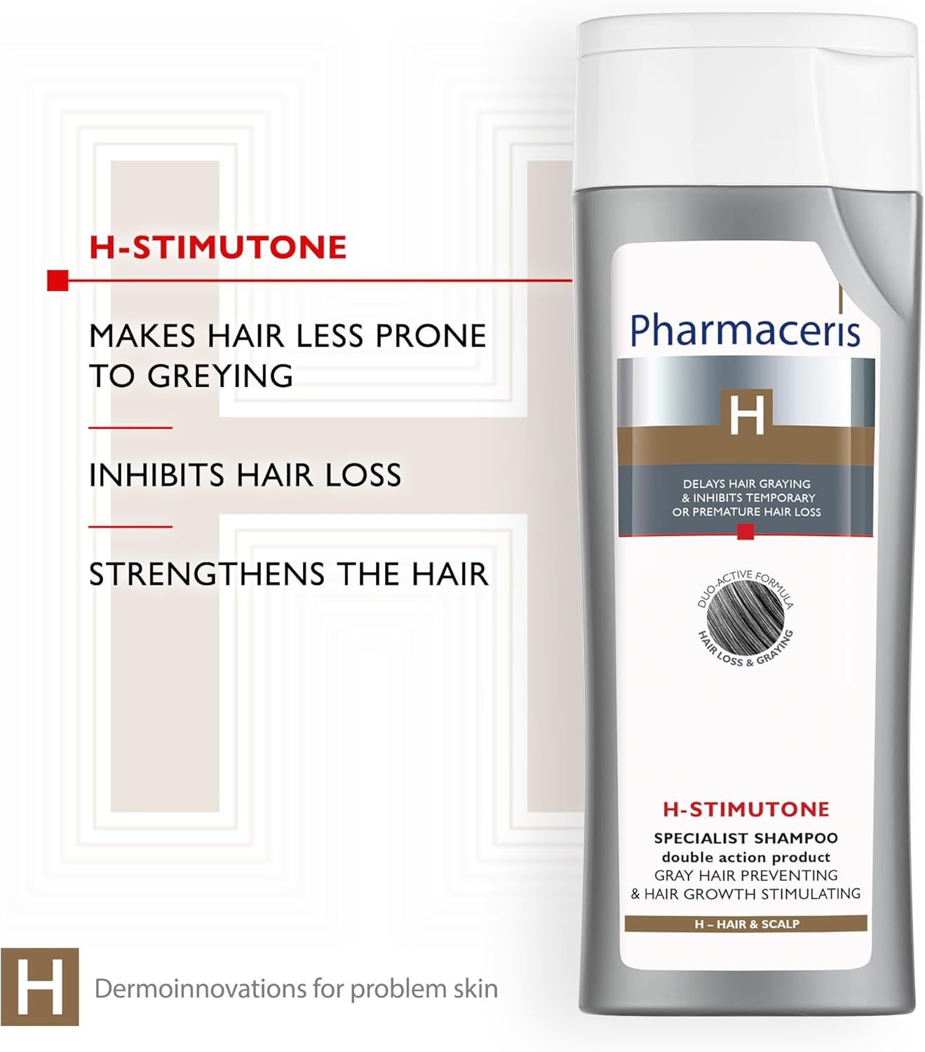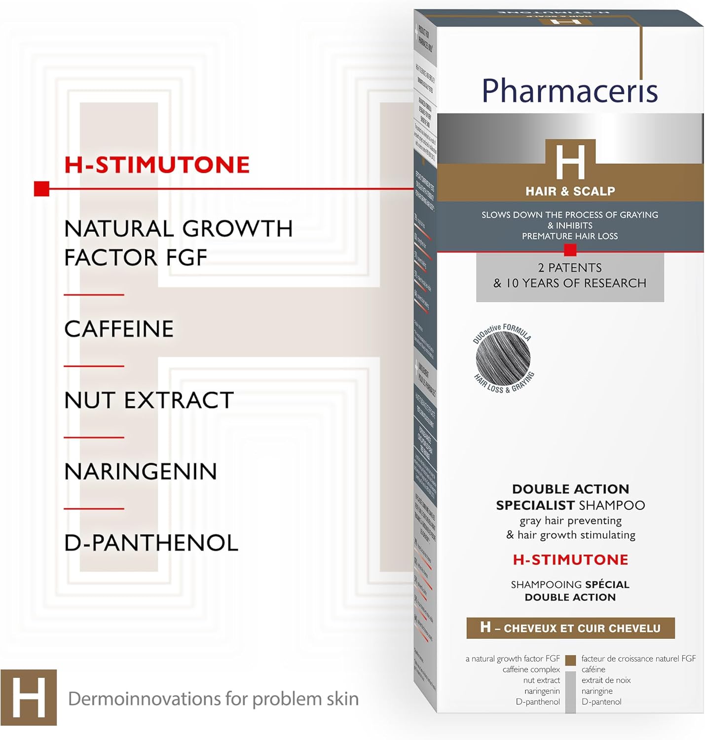 About this item FOR MEN & WOMEN WITH HAIR CONCERNS Designed for those prone to hair loss, balding, and greying, suitable for weakened hair prone to premature aging. DOUBLE ACTION FORMULA Effectively addresses hair greying and loss due to genetic aging, stress, poor diet, and environmental factors. NATURAL INGREDIENTS Contains concentrated naringenin, nut extract, caffeine, Natural Growth Factor FGF complex, D-panthenol, and cationic polymers. HAIR & SCALP CARE ROUTINE Use daily or at least 3 times a week, gently massage into wet hair, rinse thoroughly. Gradually darkens gray hair with each use. EFFECTIVE USAGE INSTRUCTIONS Apply the shampoo onto wet hair, gently massage for 2-3 minutes, then rinse. For enhanced results, supplement with Pharmaceris H-STIMUPEEL weekly and use with H-STIMULINUM conditioner and H-STIMUFORTEN product. › See more product details,FOR MEN & WOMEN WITH HAIR CONCERNS Designed for those prone to hair loss, balding, and greying, suitable for weakened hair prone to premature aging,DOUBLE ACTION FORMULA Effectively addresses hair greying and loss due to genetic aging, stress, poor diet, and environmental factors,NATURAL INGREDIENTS Contains concentrated naringenin, nut extract, caffeine, Natural Growth Factor FGF complex, D-panthenol, and cationic polymers,HAIR & SCALP CARE ROUTINE Use daily or at least 3 times a week, gently massage into wet hair, rinse thoroughly. Gradually darkens gray hair with each use,EFFECTIVE USAGE INSTRUCTIONS Apply the shampoo onto wet hair, gently massage for 2-3 minutes, then rinse. For enhanced results, supplement with Pharmaceris H-STIMUPEEL weekly and use with H-STIMULINUM conditioner and H-STIMUFORTEN product