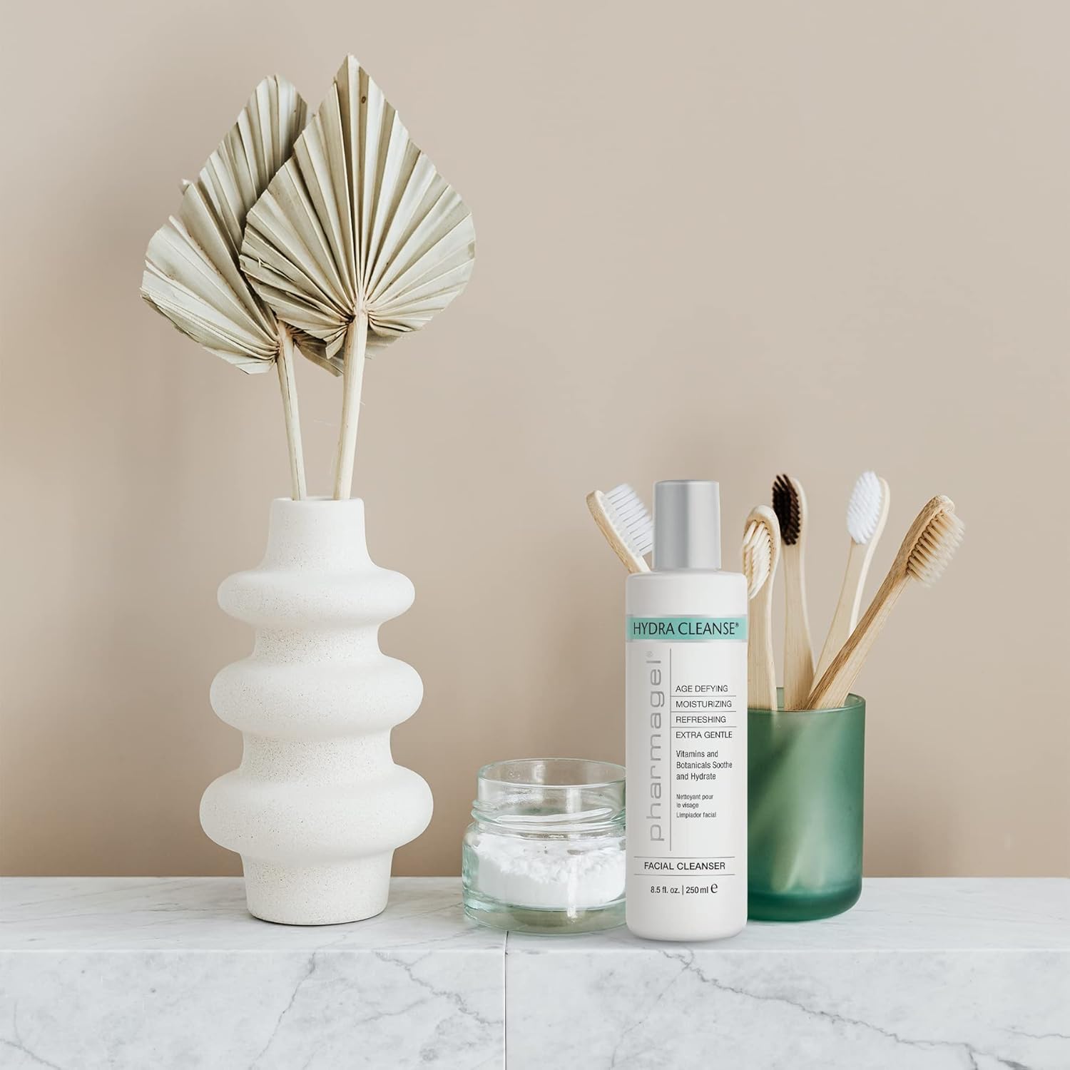 About this item HYDRA CLEANSE Hydra Cleanse is formulated with a combination of Oat Extract and Panthenol to thoroughly cleanse skin without stripping away essential moisture. Aloe Vera deeply nourishes and moisturizes skin, helping complexions to appear calm with a fresh, radiant glow.ear calm with a fresh, radiant glow. ULTRA MOISTURIZING AND NOURISHING Our Facial Cleanser Contains Aloe Vera and Oat, which help nourish and moisturize the skin. This Facial Cleanser gently removes make-up and dirt while leaving your skin feeling smooth and soft. Great for dry, sensitive or mature skin. BALANCED FACIAL CLEANSER This cleanser is water rinseable and pH balanced. It gently cleanses and benefits all skin types. Hydra Cleanse is non-drying, non-stripping, and non-abrasive for even the most sensitive skin types. After use, your skin is left feeling smooth, soft, and clean. EXTRACT REVITALIZE SKIN APPEARANCE An all natural foaming gel cleanser that sweeps away pore-clogging buildup and residue. Leaving skin softer, smoother, and cleaner. A delicate combination of various seaweed extracts and other moisturizing botanicals make this formula suitable for all skin types. TIPS & APPLICATION Can also be used as a moisturizing shaving cream. Hydra Cleanse is a great shaving alternative for men prone to irritation. Massage in a circular motion on facial areas morning and evening. Rinse with lukewarm water and pat dry. Gentle enough to use around eye area. Follow with Botanical Tonique and appropriate Pharmagel moisturizers. See more product details,HYDRA CLEANSE Hydra Cleanse is formulated with a combination of Oat Extract and Panthenol to thoroughly cleanse skin without stripping away essential moisture. Aloe Vera deeply nourishes and moisturizes skin, helping complexions to appear calm with a fresh, radiant glow.ear calm with a fresh, radiant glow,ULTRA MOISTURIZING AND NOURISHING Our Facial Cleanser Contains Aloe Vera and Oat, which help nourish and moisturize the skin. This Facial Cleanser gently removes make-up and dirt while leaving your skin feeling smooth and soft. Great for dry, sensitive or mature skin,BALANCED FACIAL CLEANSER This cleanser is water rinseable and pH balanced. It gently cleanses and benefits all skin types. Hydra Cleanse is non-drying, non-stripping, and non-abrasive for even the most sensitive skin types. After use, your skin is left feeling smooth, soft, and clean,EXTRACT REVITALIZE SKIN APPEARANCE An all natural foaming gel cleanser that sweeps away pore-clogging buildup and residue. Leaving skin softer, smoother, and cleaner. A delicate combination of various seaweed extracts and other moisturizing botanicals make this formula suitable for all skin types,TIPS & APPLICATION Can also be used as a moisturizing shaving cream. Hydra Cleanse is a great shaving alternative for men prone to irritation. Massage in a circular motion on facial areas morning and evening. Rinse with lukewarm water and pat dry. Gentle enough to use around eye area. Follow with Botanical Tonique and appropriate Pharmagel moisturizers