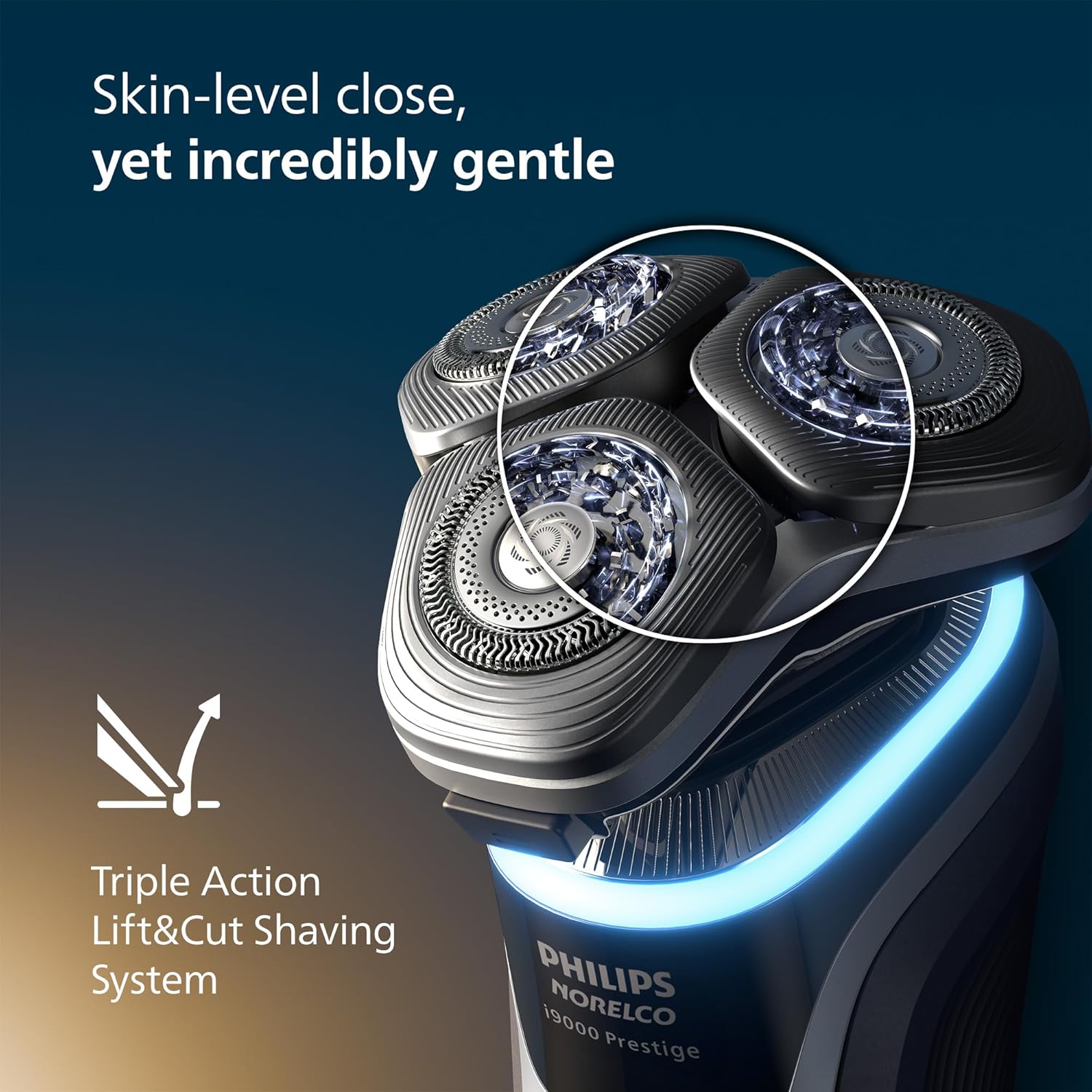 Philips Shaver Series 9000 is an intelligent electric shaver powered by AI that gives you incredible skin comfort. It provides ultimate durability with self-sharpening blades made of similar steel as in the aerospace industry, designed to stay sharp and resist even the most challenging conditions. Enjoy skin-level closeness and personalized comfort day after day. Get feedback on shaving pressure to protect your skin while cutting hair closer, even on 5-day beards. It senses, guides, and adapts to your face contours thanks to its unique SenseIQ technology. The device is dermatologically tested and features a protective SkinGlide coating, Power Adapt Sensor, and 360-degree flexing heads that make shaving comfortable and reduce skin irritation. This is a shaver and beard trimmer men can really count on. Keep your electric razor clean with a powerful Cleaning Pod for hygiene and proper maintenance. Shave wet or dry, and take care of defining your mustache or sideburns with the pop-up trimmer. Philips Shaver Series 9000 works perfectly as a head shaver as well. With 60 minutes of shaving time on a single charge, take your time and effortlessly follow the contours of your face for a clean shave that adjusts to your beard. ¹ Source: Euromonitor International Limited, retail value RSP, per body shavers category definition, 2023 data, research conducted in December 2023 ² vs predecessor S9000 ³ vs coating without beads 4 Based on Philips Series S7000 and Philips Shaving app users in 2019 5 Comparing shaving debris after using cleaning fluid vs water in the cartridge 6 2 years + 3 years warranty upon registration within 90 days on Philips.com,From the #1 electric shaver brand¹: shaver powered by AI, superior closeness² and personalized skin comfort; with SenseIQ Technology it senses, guides, and adapts to you,The shaver that cuts hair in any direction with 360-degree rotating Dual SteelPrecision blades, patented Lift & Cut shaving system, efficient even with 5-day dense beards,Always the optimal pressure: the intelligent Pressure Guard Sensor protects your skin, and the light guides you when youāre pressing your shaver too hard or too little,Maximum skin contact: flexible heads turn 360 degrees to follow facial contours for a thorough and comfortable shave, even in difficult areas - the neck or upper lip,Designed for life, built to last: Up to 5 years warranty6 and 2-year selfsharpening blades lifetime so you can enjoy ultimate reliability and performance everyday,The set includes: 1x Philips Shaver Series 9000, 1x Quick Clean Pod with 4 cartridges, 1x pop-up trimmer, 1x beard styler, 1x charging stand and more accessories