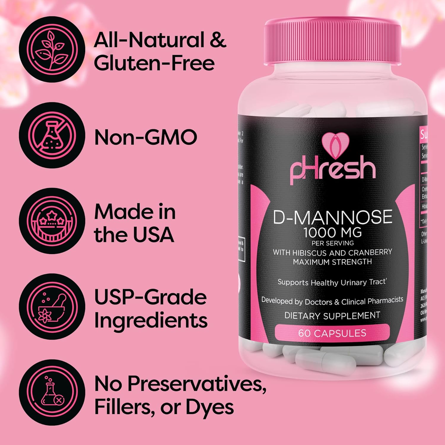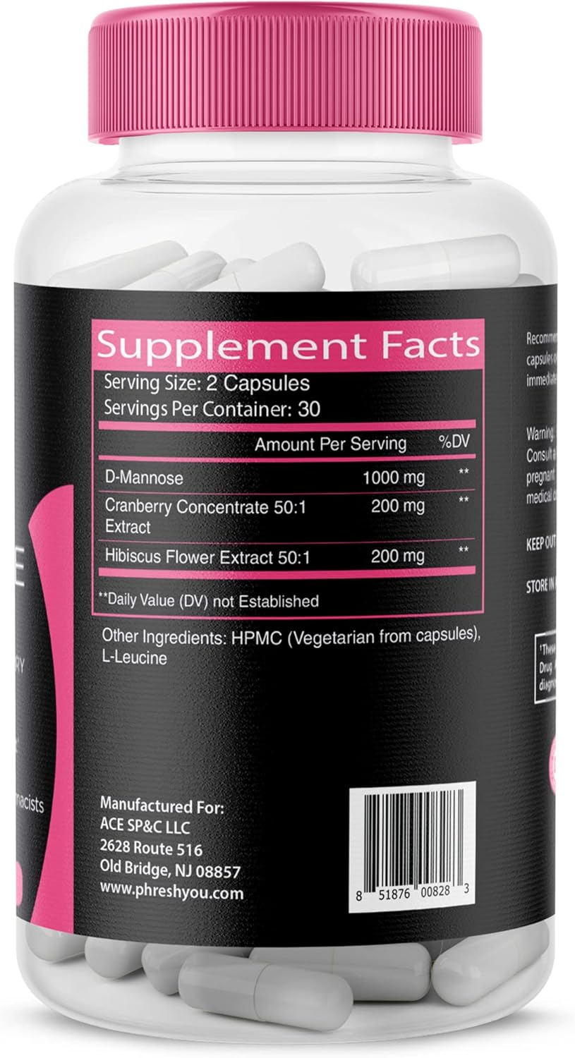 Phresh D-Mannose With Cranberry Capsules For Women And Men, Maximum Strength 1000 Mg Per Serving - Supports: Urinary Tract Health - Made In The Usa