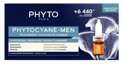 Phyto Phytocyane - Men Anti-Hair Loss Treatment 12 X 3,5Ml Is A Care Intended To Fight Against Men Hair Loss: Hereditary, Severe, Or In Case Of Thinning Hair. It Is Indicated In Case Of Durable Hair Loss (More Than 6 Months) And Which Progresses Over Time, A Targeted Location At The Level Of The Temples, Gulfs And Top Of The Skull. Its Formula Associates 3 Essential Actions To Fight Men Hair Loss And Stimulate The Growth Of Thicker Hair: Anti-Hair Loss Thanks To Bio-Vectorized Amino Acid Selected To Fight Against The Miniaturisation Of The Root And Therefore The Thinning Of The Hair. Primordial Action On Growth With The Patented Organic Maca Extract Identified For Its Action On The Hair Cycle, To Strengthen The Anchoring Of The Hair And Help Maintain The Hair In The Growth Phase. Density: It Increases The Capillary Density Of Thinning Hair. The Patented Shiitake Extract Combined With The Massage Promotes Microcirculation, Essential For The Growth Of Strong Hair. The Results Are Visible After 3 Months, The Fall Is Slowed Down, Hair Growth Stimulated For Denser And Stronger Hair. Without Rinsing, Non Oily, Non Sticky. 95% Of Ingredients Are Of Natural Origin. Made In France
