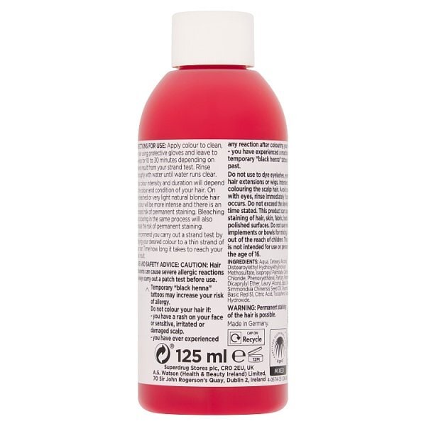 Warning: Permanent Staining Of The Hair Is Possible. Care And Safety Advice Caution: Hair Colourants Can Cause Severe Allergic Reactions So Always Carry Out A Patch Test Before Use. Temporary “Black Henna” Tattoos May Increase Your Risk Of Allergy. Do Not Colour Your Hair If: - You Have A Rash On Your Face Or Sensitive, Irritated Or Damaged Scalp - You Have Ever Experienced Any Reaction After Colouring Your Hair - You Have Experienced A Reaction To A Temporary “Black Henna” Tattoo In The Past Do Not Use To Dye Eyelashes, Eyebrows, Hair Extensions Or Wigs. Intended Only For Colouring The Scalp Hair. Avoid Contact With Eyes, Rinse Immediately If Contact Occurs. Do Not Exceed The Development Time Stated. This Product Can Cause Staining Of Hair, Skin, Fabric, Hard And Polished Surfaces So Rinse Any Splashes Immediately. Do Not Use Metal Implements Or Bowls For Mixing. Keep Out Of The Reach Of Children. This Product Is Not Intended For Use On Persons Under The Age Of 16