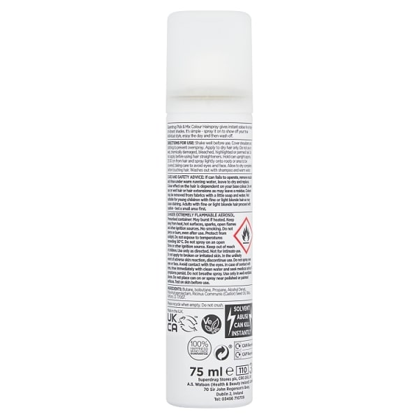 Product Information:Superdrug Pick &Amp; Mix Instant Hair Colour Spray Is A No-Fuss, No Commitment Way To Add A Tint To Your Hair In An Instant,Benefit:ItβS Simple β Spray It On To Show Your True Individual Style, Enjoy The Day And Then Wash Off,Warning Or Restrictions:Use Only As Directed. Not For Intimate Use. Do Not Apply To Broken Or Irritated Skin. In The Unlikely Event Of Adverse Skin Reaction, Discontinue Use. Avoid Contact With The Eyes. In Case Of Contact With The Eyes, Rinse Immediately With Clean Water And Seek Medical Advice If Symptoms Persist. Do Not Inhale Spray. Do Not Use In Confined Spaces. Do Not Place Can On Or Spray Near Polished Or Painted Surfaces,Product Specification:Butane, Isobutane, Propane, Alcohol Denat., Polyvinylcaprolactam, Ricinus Communis Seed Oil (Castor Oil), Silica, Parfum, Ci 77007,Product Uses:Shake Can Well. Hold Can Upright 25 β 30 Cm From Hair And Spray Evenly. Do Not Use On Wet, Chemically Damaged, Bleached, Highlighted Or Permed Hair. Protect Clothes From Over-Spray And Avoid Spraying On Furnishings As Staining May Occur. Washes Out With Shampoo And Warm Water,Recyclable:Can Metal - Widely Recycled Cap Plastic β Check Local Recycling,Tips And Advice:Protect Clothes From Over-Spray And Avoid Spraying On Furnishings As Staining May Occur. Washes Out With Shampoo And Warm Water
