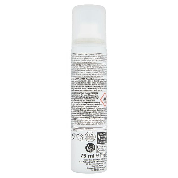 Product Information:Superdrug Pick &Amp; Mix Instant Hair Colour Spray Is A No-Fuss, No Commitment Way To Add A Pastel Tint To Your Hair In An Instant,Benefit:Colours Can Be Used Standalone Or Mixed To Create Your Own Personal Colour, Or Blend Shade To Shade To Create A Unique Look,Warning Or Restrictions:Use Only As Directed. Not For Intimate Use. Do Not Apply To Broken Or Irritated Skin. In The Unlikely Event Of Adverse Skin Reaction, Discontinue Use. Avoid Contact With The Eyes. In Case Of Contact With The Eyes, Rinse Immediately With Clean Water And Seek Medical Advice If Symptoms Persist. Do Not Inhale Spray. Do Not Use In Confined Spaces. Do Not Place Can On Or Spray Near Polished Or Painted Surfaces,Product Specification:Butane, Isobutane, Propane, Alcohol Denat., Zea Mays Starch, Dicocoylethyl Hydroxyethylmonium Methosulfate, Propylene Glycol, Parfum, Hydroxycitronellal, Citronellol, Ci 77891, Ci 77492, Ci 42090:2,Product Uses:Shake Can Well. Hold Can Upright 25 β 30 Cm From Hair And Spray Evenly. Do Not Use On Wet, Chemically Damaged, Bleached, Highlighted Or Permed Hair. Protect Clothes From Over-Spray And Avoid Spraying On Furnishings As Staining May Occur. Washes Out With Shampoo And Warm Water,Recyclable:Can Metal - Widely Recycled Cap Plastic β Check Local Recycling,Tips And Advice:Protect Clothes From Over-Spray And Avoid Spraying On Furnishings As Staining May Occur. Washes Out With Shampoo And Warm Water