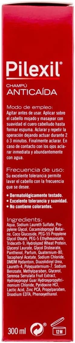 ABOUT THE PRODUCT: 1 > Pilexil Anticaida Champu 500 Ml Anti Hair-Loss Anti Queda Pilexil champú anticaída , champú especialmente indicado para frenar la caída del cabello como tratamiento único o como complemento a otros tratamientos anticaída. Es un eficaz producto de tratamiento, que además de frenar la caída del cabello y estimular su crecimiento, posee todas las propiedades de un champú de belleza: Es de uso frecuente. PH adecuado al cabello (pH5,5). Contiene acondicionadores especialesque facilitan el peinado, al tiempo que proporcionan al cabello la suavidad y la fuerza necesarias para conseguir un aspecto sano y saludable (pH5,5)