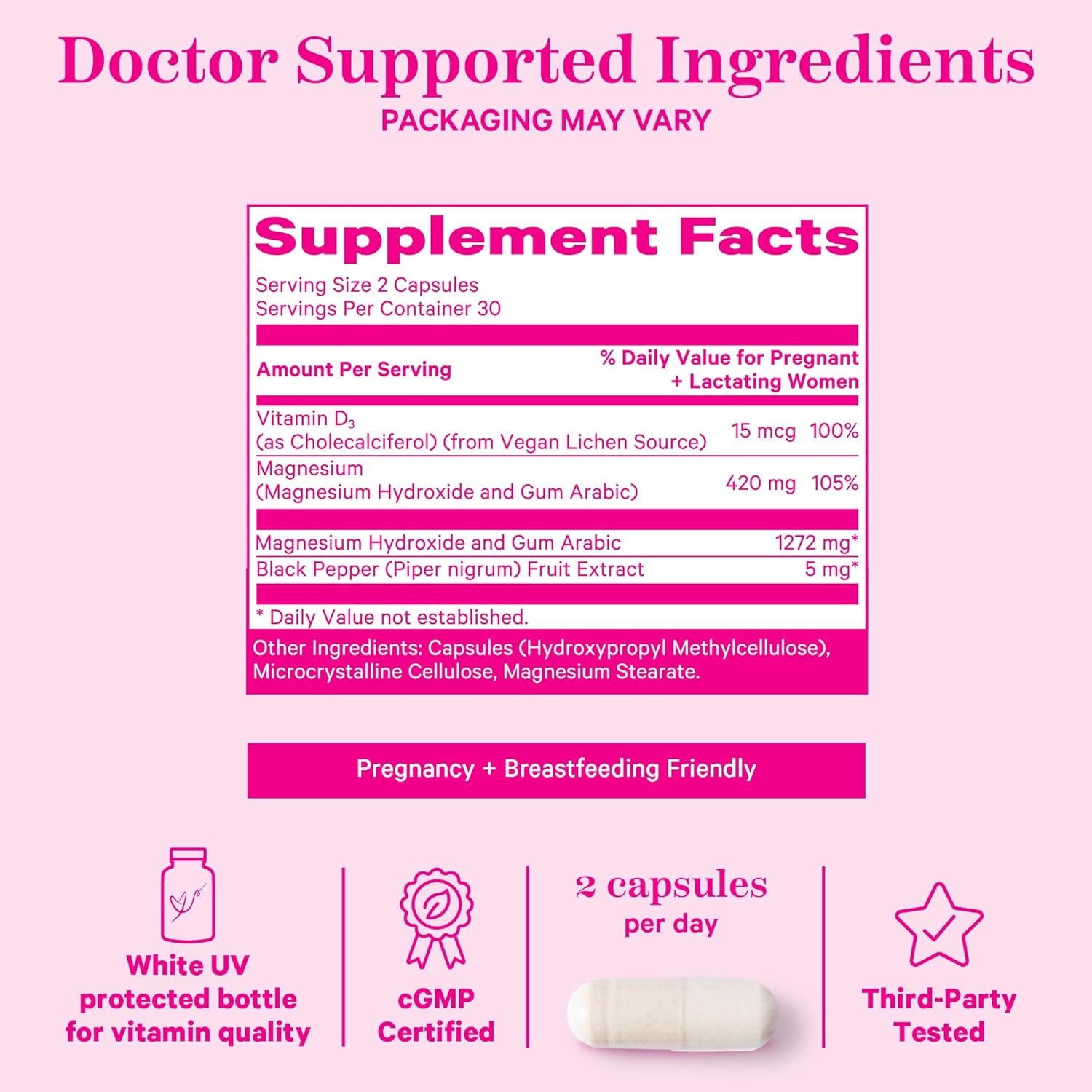 Pink Stork Magnesium Supplement For Women With Vitamin D - Mood, Natural Calm & Energy Levels - Digestion, Heartburn, & Constipation Support For Pregnancy - Breastfeeding Friendly - 60 Capsules