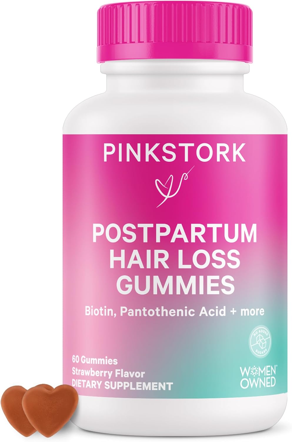 Postpartum Essentials: Most women experience hair loss after pregnancy - it doesn't have to be this way! Pink Stork Postpartum Hair Loss Gummies aren't just your ordinary biotin supplement - we've added Pantothenic Acid, Vitamin E, Vitamin A, Vitamin B12, and more. Our Postpartum Hair Gummies are breastfeeding-friendly for all momsHair: As hormones rise and fall through the fourth trimester - hair shedding is common. We've got you, mama - help your hair glow and grow! Our tasty strawberry vitamins aren't just for hair growth - support your scalp health, hair strengthening, regrowth, and radianceSkin and Nails: As your body adjusts postpartum, skin changes and brittle nails are common. Boost keratin production and Vitamin E to strengthen nails, support your complexion, and get your glow backPostnatal Vitamins for Women: Take two gummies daily alongside any Pink Stork Postnatal product for the ultimate postnatal ritual. We offer Postpartum Mood Support, Lactation Support products, and more to support your body after babyWe are Women-Owned and Women-Run! Our founder and CEO, Amy Suzanne, is a mom of 6 children and knows how important it is to give new moms products you can trust. Over 80% of our employees are women, and we create clean, trusted, and effective products for every stage of a woman's journey. We are on a mission to provide women with hope and positively impact everyone that comes in contact with Pink Stork