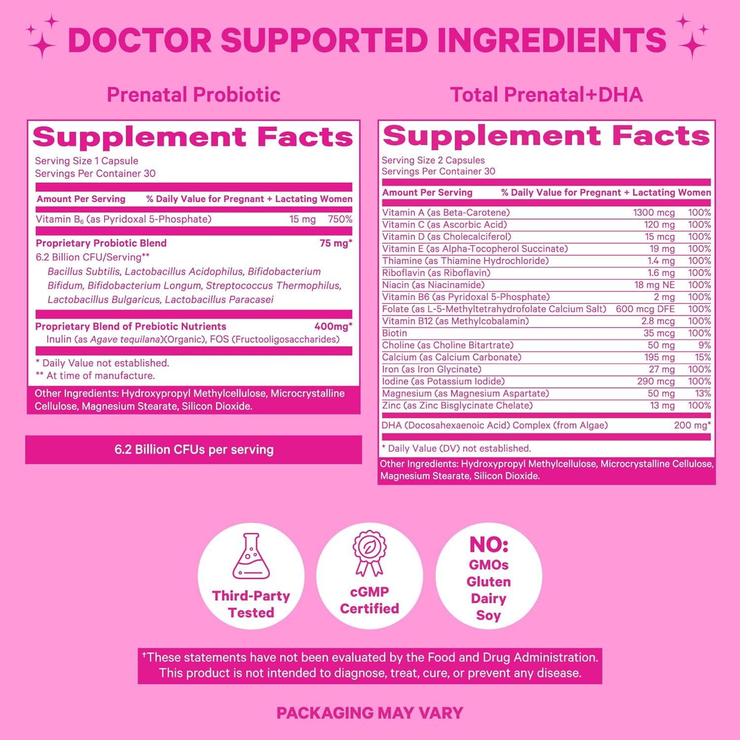 Pink Stork Prenatal Vitamin Duo: Prenatal Vitamins And Probiotics For Pregnant Women -Morning Sickness And Fetal Development Support With Dha, Folate, Vitamin B6, And More - 2 Products, 90 Capsules
