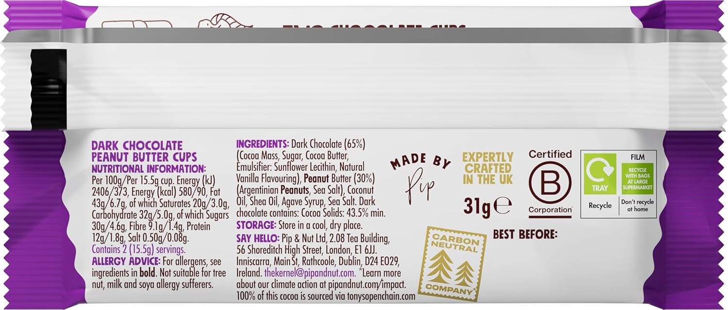 Pip & Nut - Dark Chocolate Almond Butter Cups (15 Pack - 2 Cups Per Pack) | Single Origin Chocolate, Real Almond Butter, Natural Nut Butter, No Palm Oil, Vegan, Gluten Free, High In Fibre