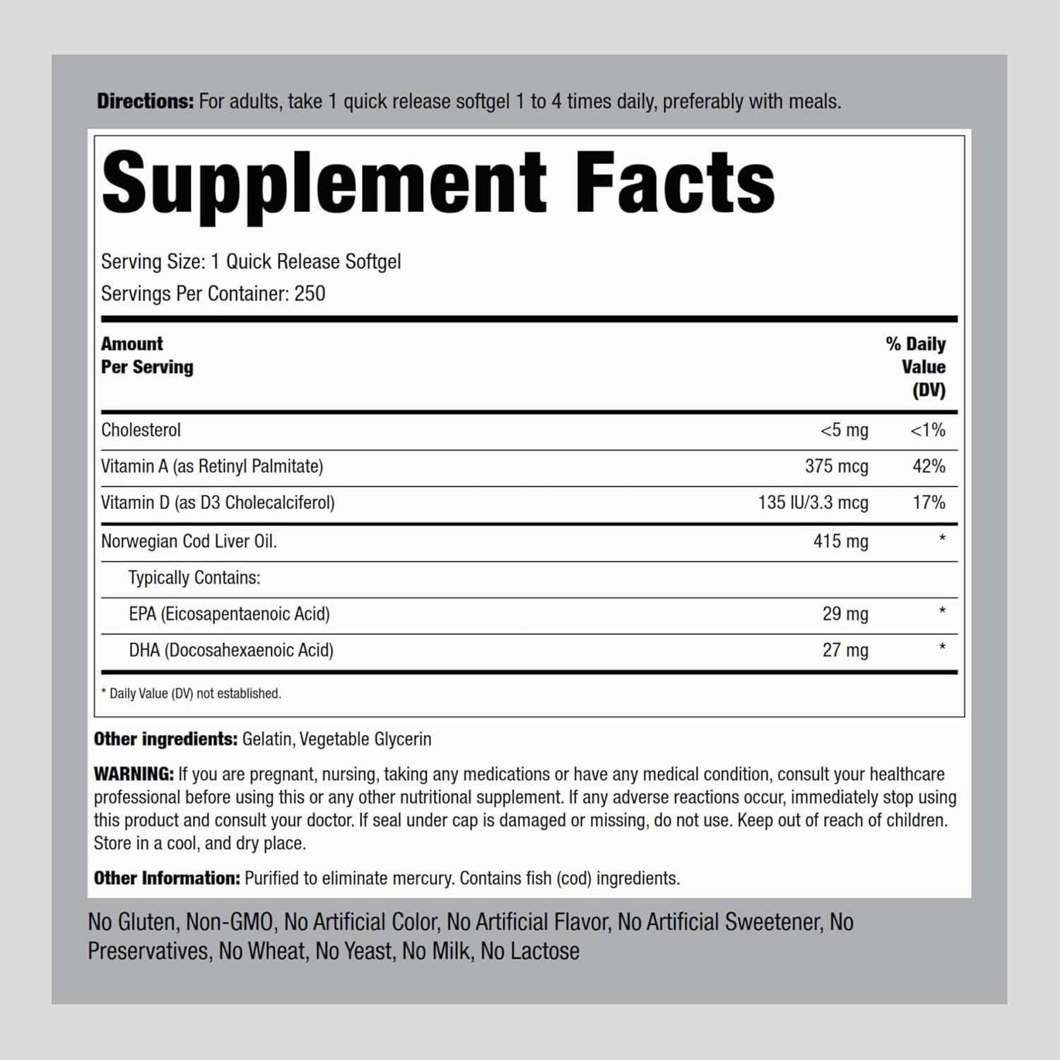 Cod liver oil is a remarkable superfood loaded with Omega-3 fatty acids, vitamin A and vitamin D. Piping Rock is proud to offer you our Engelvaer Ultra Norwegian Cod Liver Oil -- a superior quality formulation sourced from clear waters off the islands of Norway. Purified to remove mercury, our cod liver oil presents all the advantages of one of nature's greatest superfoods in each easy-to-swallow quick release softgel! Piping Rock's Promise Piping Rock proudly offers an ever-growing selection of products designed to help you achieve your unique wellness goals. We verify all products with third-party, FDA-registered agencies ensuring purity, potency, safety, and innovation in everything we do. We’re committed to supporting you in your journey to healthy living, and we thank you for choosing us!