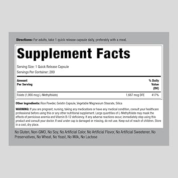Each L-Methylfolate (5-MTHF) capsule provides you 1000 mcg of this bioavailable form of folic acid