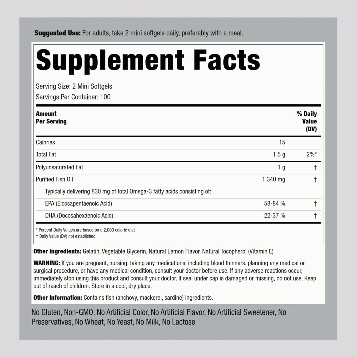 Piping Rock Omega-3 Mini Fish Oil is anything but mini on benefits! Our formula is loaded with 1300 mg of purified fish oil in each softgel. This high potency supplement is the best way to get all the benefits of omega-rich fish with delicious lemon flavor. Sourced from cold-water fish and brimming nutrients, our lemon-flavored Omega-3 Fish Oil 1300 mg is an easy, affordable way to support a healthy routine! Recommended for adult men and women looking to supplement a strong diet. Piping Rock's Promise Piping Rock proudly offers an ever-growing selection of products designed to help you achieve your unique wellness goals. We verify all products with third-party, FDA-registered agencies ensuring purity, potency, safety, and innovation in everything we do. We’re committed to supporting you in your journey to healthy living, and we thank you for choosing us!