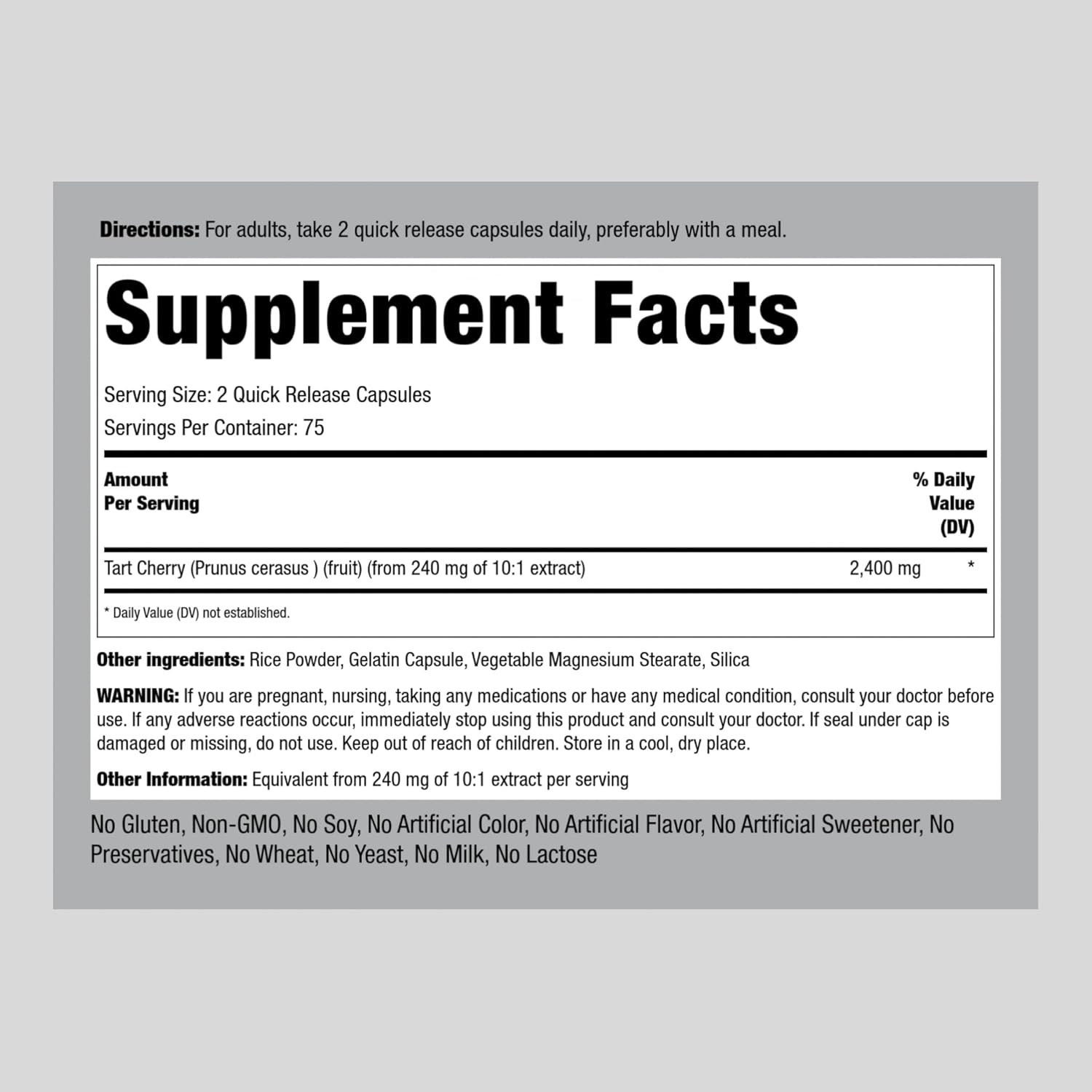 Tart cherry or Prunus cerasus is a species of Prunus, native to greater Europe and southwest Asia. It was originally discovered centuries ago in the Carpathian Basin where it was cultivated for its sour fruit. This tart form of cherry was first utilized to make tart cherry juice and tart cherry pie. Today tart cherry can be found in various supplement forms, such as pills, tablets, gummies, and powder. Scientific discoveries and research have revealed that the antioxidant flavonoids found in these tart cherries provide strong nutritional value and have dynamic health benefits. Anthocyanin is the primary flavonoid that gives the fruit its dark red pigment. Derived from the fruit of the Prunus cerasus tree, Piping Rock Tart Cherry Capsules are sourced from the finest and best supply of this succulent fruit available. Each serving packs a powerful punch of naturally occurring antioxidants of 2,400 mg of tart cherry! Our premium formula is lab tested to guarantee maximum purity and potency, making it the ultimate choice for your daily supplement routine. Piping Rock's Promise Piping Rock proudly offers an ever-growing selection of products designed to help you achieve your unique wellness goals. We verify all products with third-party, FDA-registered agencies ensuring purity, potency, safety, and innovation in everything we do. We’re committed to supporting you in your journey to healthy living, and we thank you for choosing us!