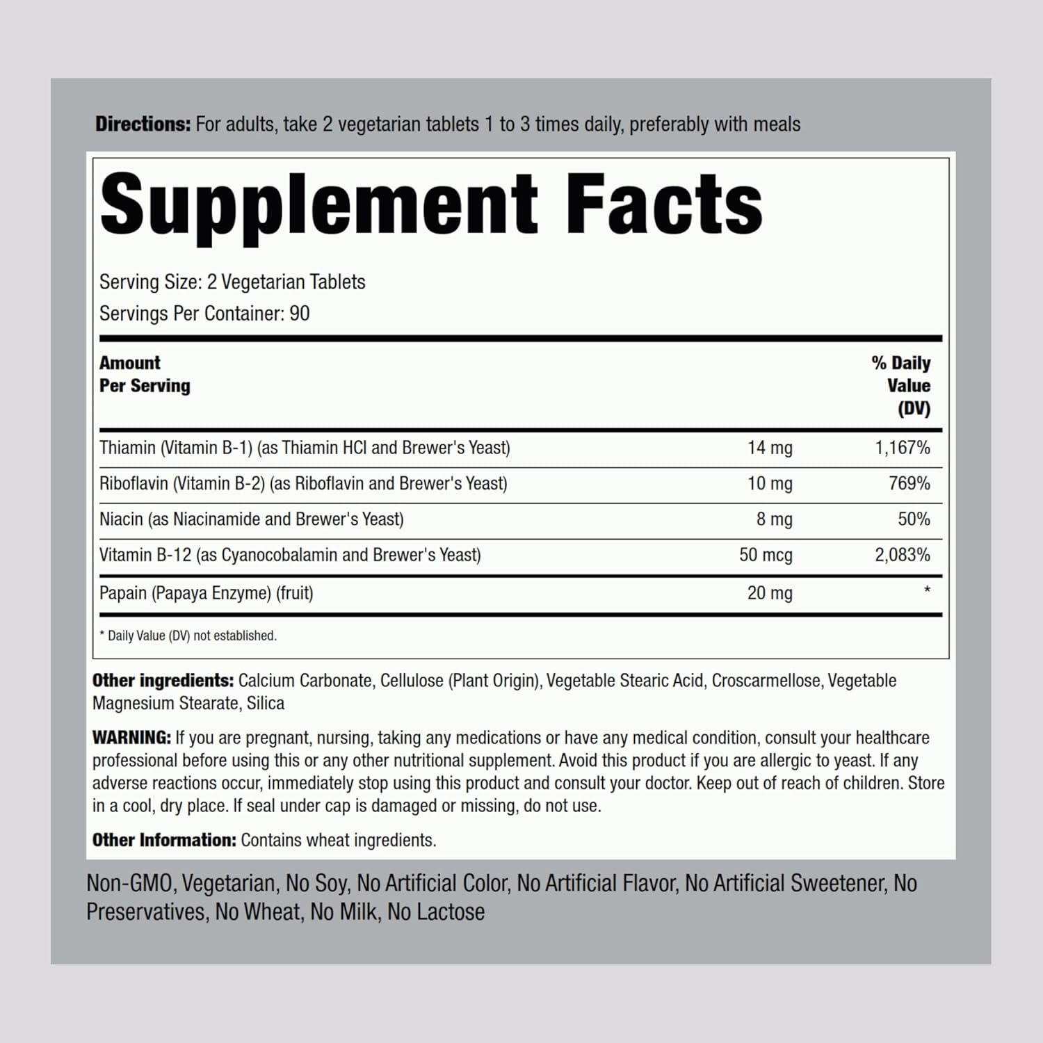 With our busy lives itās easy to feel overexerted and low on vitality sometimes. That's why many people choose to incorporate Vitamin B into their nutritional regimen. There are now many forms of Vitamin B supplements including tablets, pills, gummies, capsules, powder, and liquid drops. Looking for the best Vitamin B supplement to add to your health routine? Thatās why weāve created our fast-dissolve tablets with B Complex Plus 50 mcg of Vitamin B12 (as cyanocobalamin and Brewer's Yeast). Our super high potency formula has Thiamin, Riboflavin, Niacin, and Papaya enzyme included that work synergistically within your body. Grab a bottle and enjoy the benefits of this quality supplement today! Piping Rock's Promise Piping Rock proudly offers an ever-growing selection of products designed to help you achieve your unique wellness goals. We verify all products with third-party, FDA-registered agencies ensuring purity, potency, safety, and innovation in everything we do. Weāre committed to supporting you in your journey to healthy living, and we thank you for choosing us!