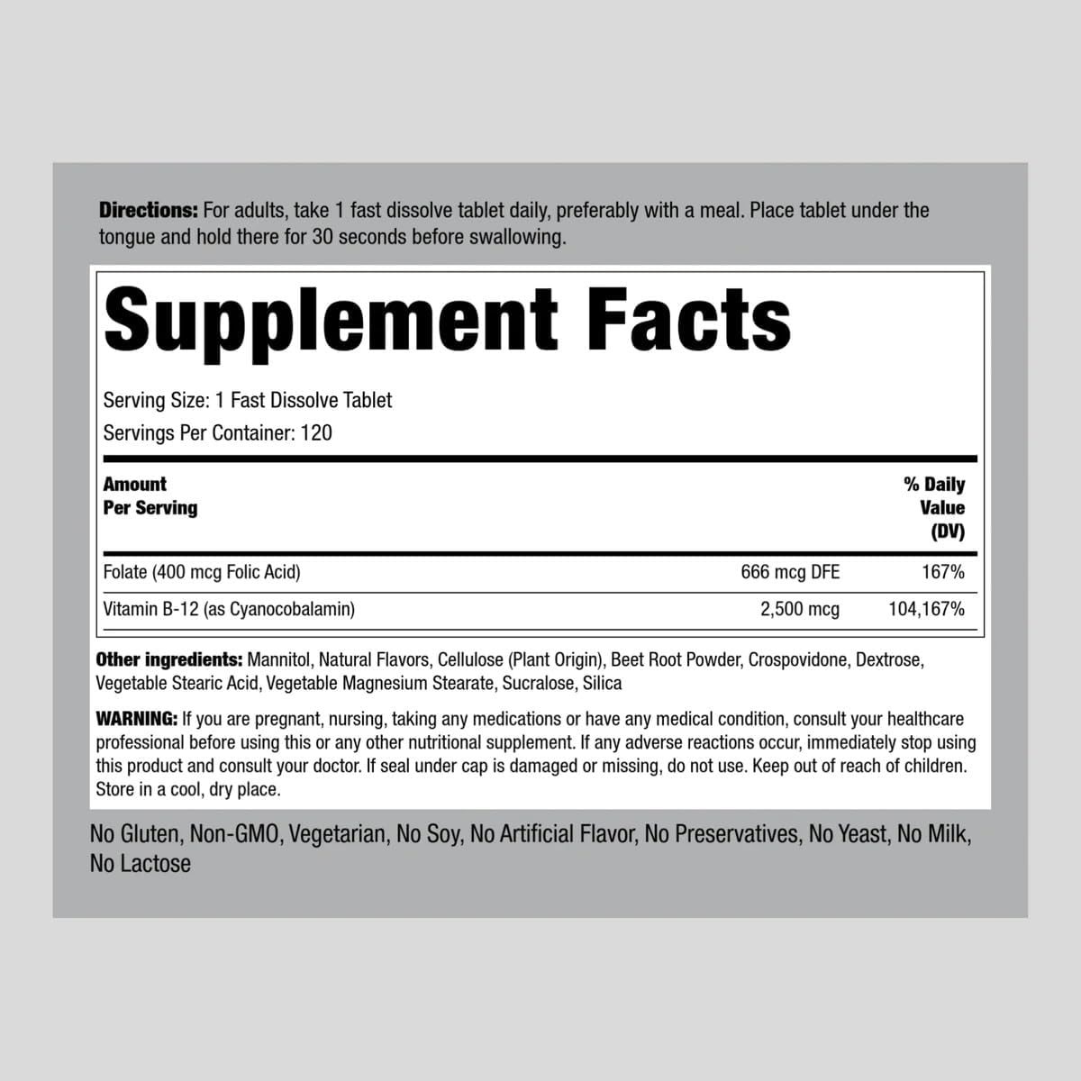 B12 vitamins are essential vitamins that are water soluble, like all the vitamins in the B vitamin family. Since our bodies do not produce water soluble vitamins, we must consume these nutrients daily to meet the recommended amount. There are many ways to enjoy this vitamin with pills, powder, gummies, capsules, spray, and liquid drops. Looking for the best highest quality source of this supplement to support a healthy lifestyle? Searching for the ultimate extra strength vitamin B supplement? Introducing our Sublingual B12 high dose and fast dissolvable tablets in the form of cyanocobalamin that are great for daily use, and have a delicious berry flavor! With 2500 mcg of Vitamin B12, you’ll get the nutrients your body wants when it needs them the most. We also added 400 mcg of folic acid to this complex for added benefits. Grab a bottle today! Piping Rock's Promise Piping Rock proudly offers an ever-growing selection of products designed to help you achieve your unique wellness goals. We verify all products with third-party, FDA-registered agencies ensuring purity, potency, safety, and innovation in everything we do. We’re committed to supporting you in your journey to healthy living, and we thank you for choosing us!