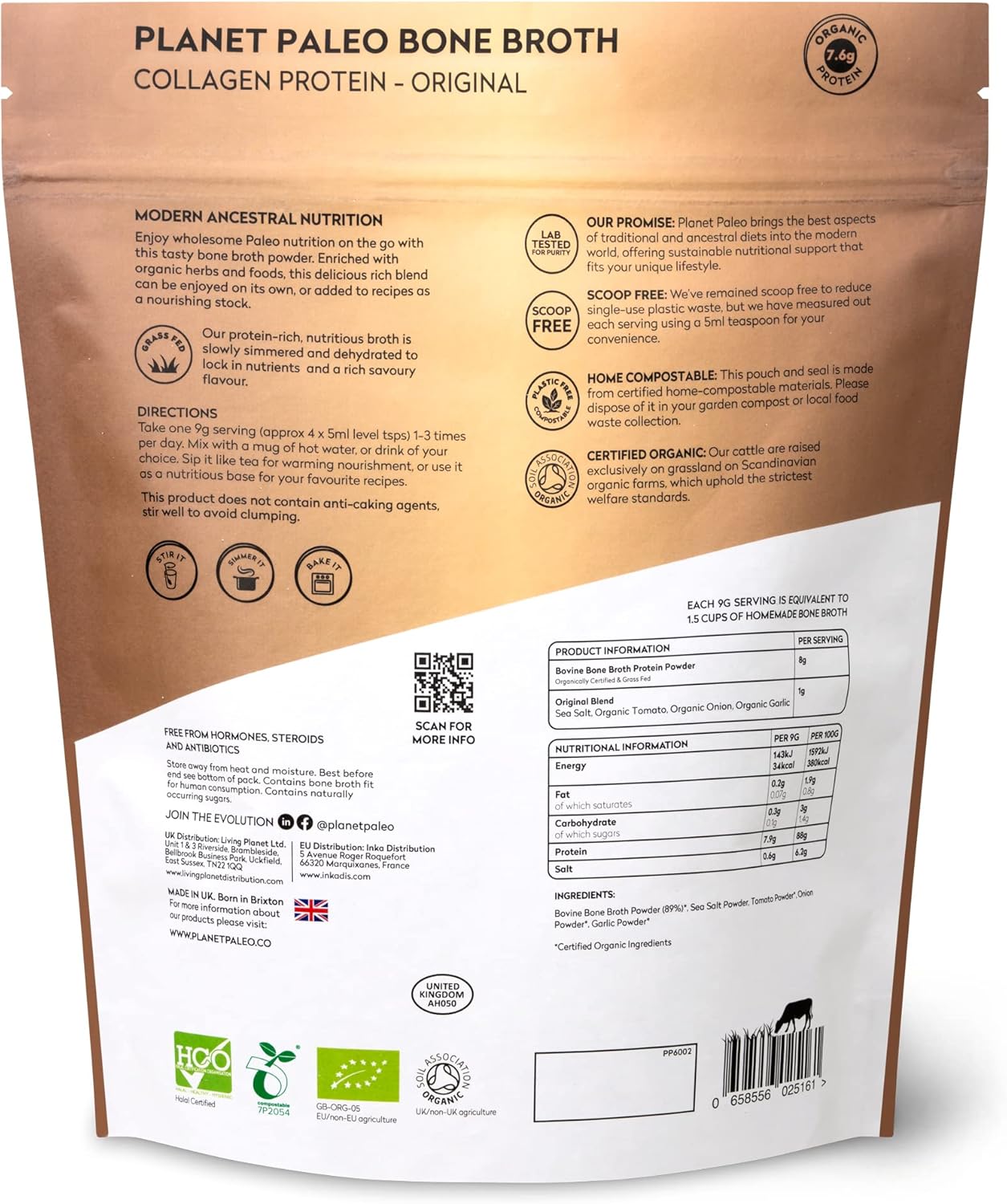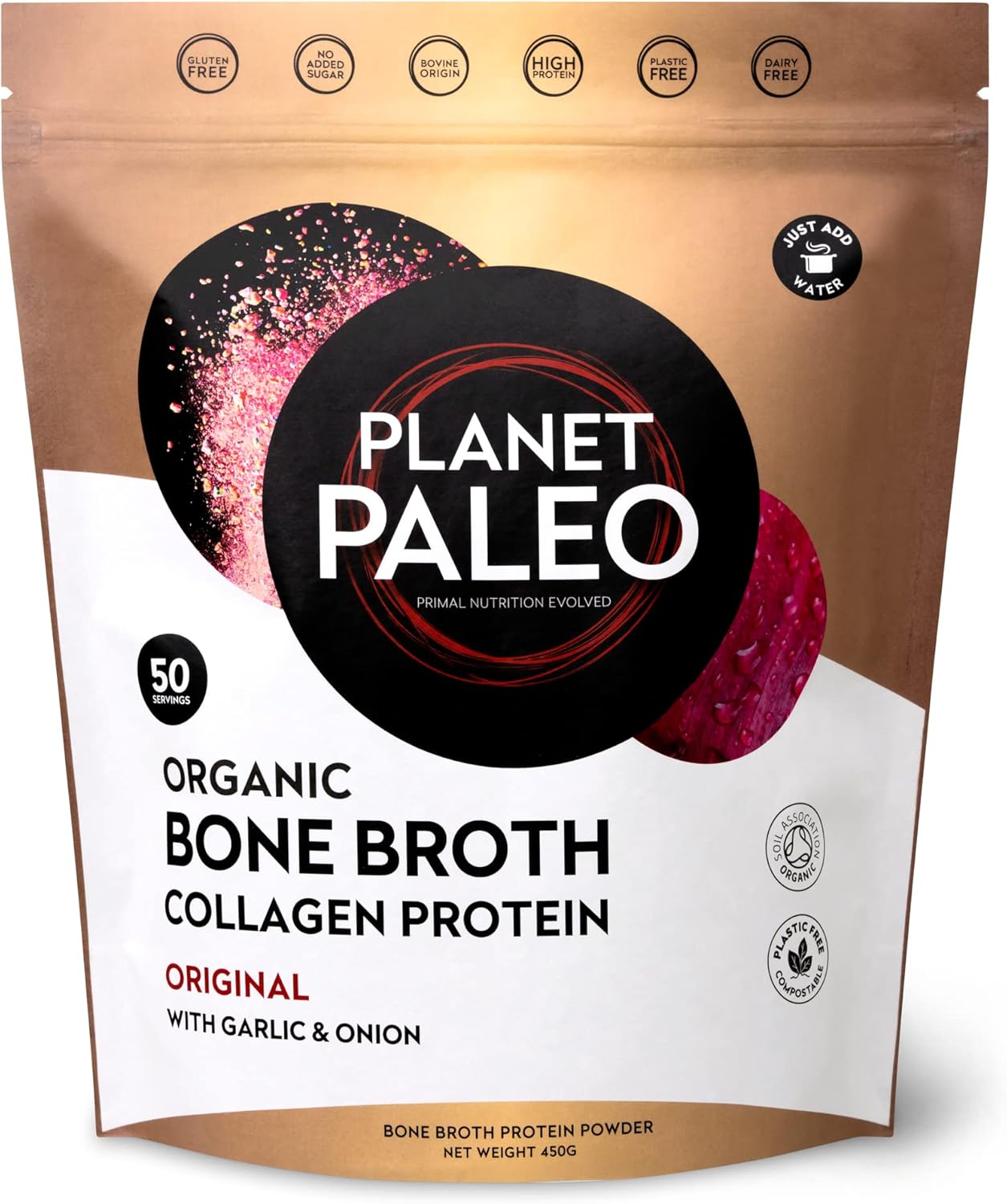 Planet Paleo Organic Bone Broth Collagen Protein Powder (450G, 50 Servings) Original With Garlic & Onion, Grass-Fed, Keto, Low Carb, High Protein Drink Or Add To Soups & Savoury Recipes