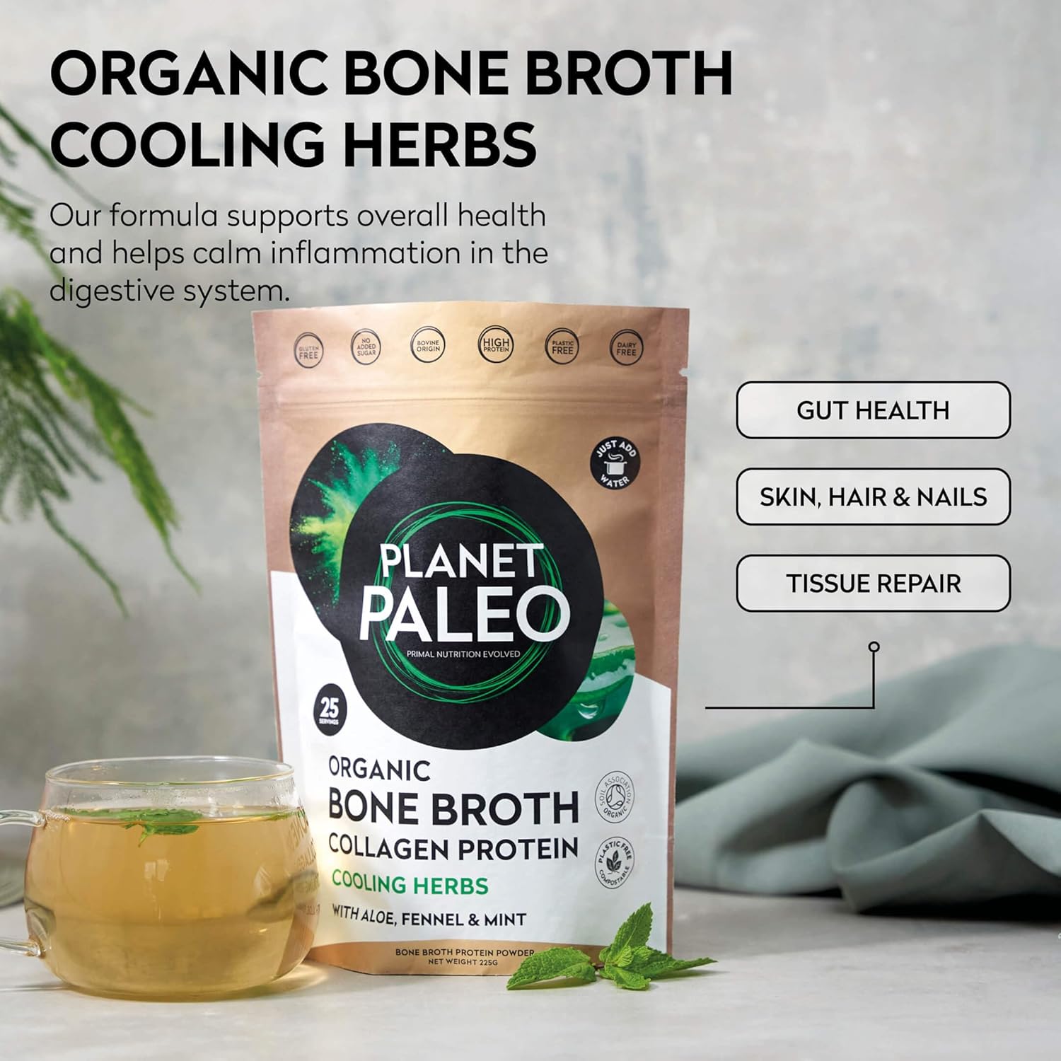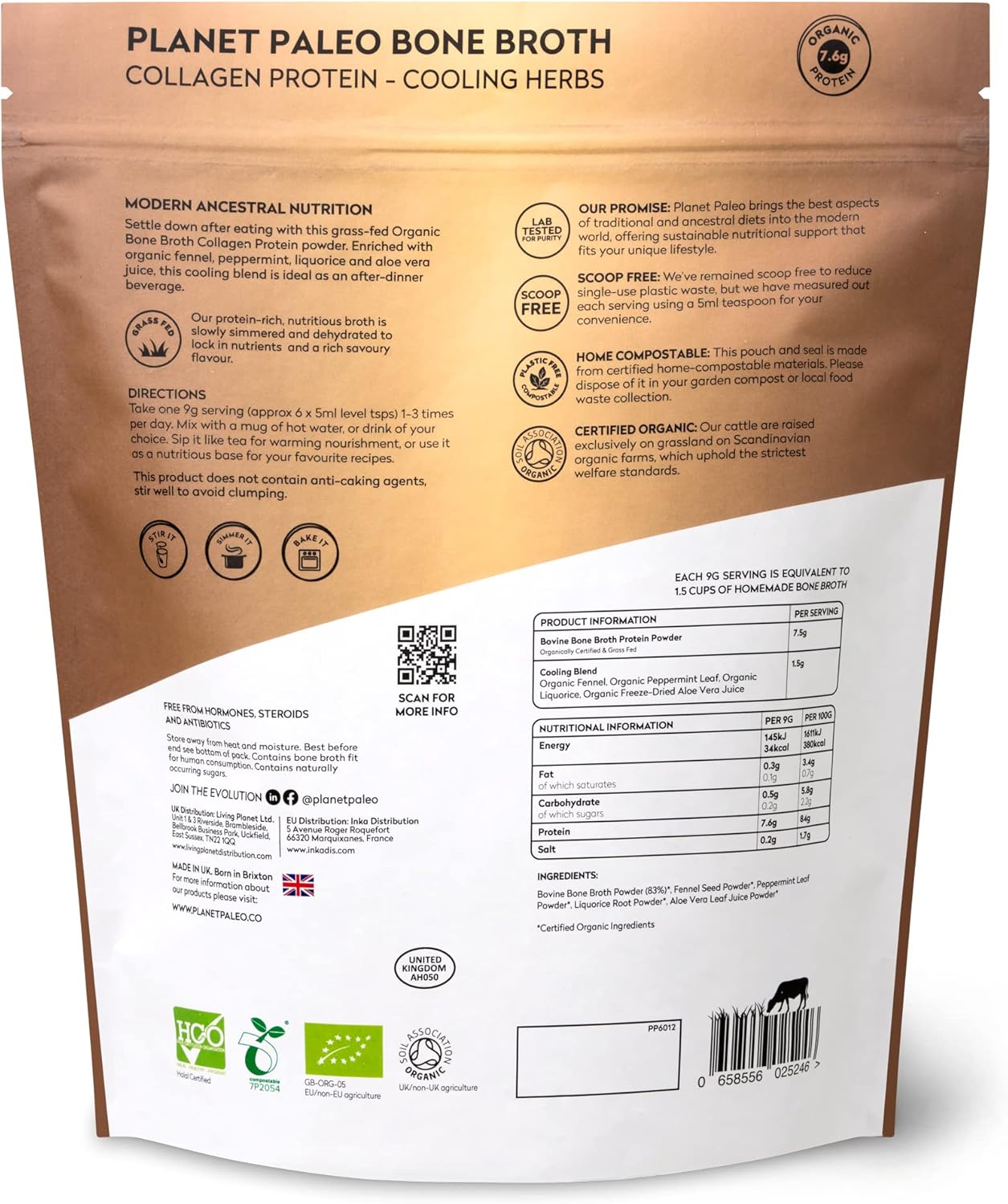 Planet Paleo Organic Bone Broth - Cooling Herbs (450G, 50 Servings) Organic, Grass Fed, High Protein | Fennel, Peppermint, Liquorice And Aloe Vera - Digestive Support