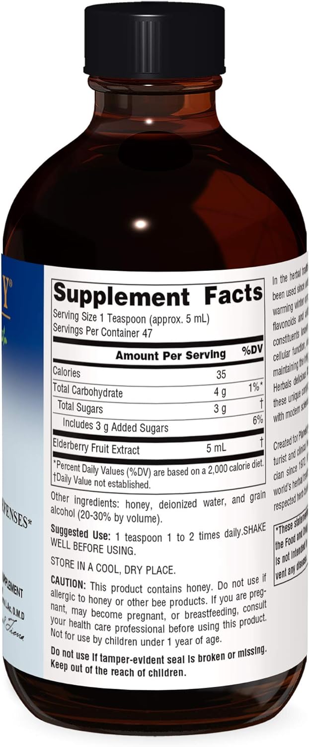 European classic for natural defenses10Features elderberry, used since antiquity, in the herbal traditions of Europe, as a wine, a syrup, and a warming winter cordial10Rich in bioflavonoids and anthocyanins, unique classes of constituents known for their beneficial effect on cellular function, and particularly for their role in maintaining the integrity of capillary walls and immune defenses10Captures elderberry's unique compounds10Unites age-old tradition with modern science to support natural defenses10Herbal supplement. Sambucus Nigra. European classic for natural defenses. Created for Planetary Formulas by licensed acupuncturist and clinical herbalist Michael Tierra. A clinician since 1972, Michael is an authority on the world's herbal traditions, and has authorized several respected herb books. In the herbal traditions of Europe, elderberry has been used since antiquity as a wine, a syrup, and a warming winter cordial. The berries are rich in bioflavonoids and anthocyanins, a unique class of constituents known for their beneficial effect on cellular function, and particularly for their role in maintaining the integrity of capillary walls. Planetary Formulas' delicious Elderberry Syrup captures these unique compounds, uniting age-old tradition with modern science to support natural defenses. (These statements have not been evaluated by the Food and Drug Administration. This product is not intended to diagnose, treat, cure or prevent any disease.) Lifestyle Recommendations: To support natural defenses, eat well, get plenty of rest and exercise regularly. Avoid the excessive consumption of cold and raw foods during winter10
