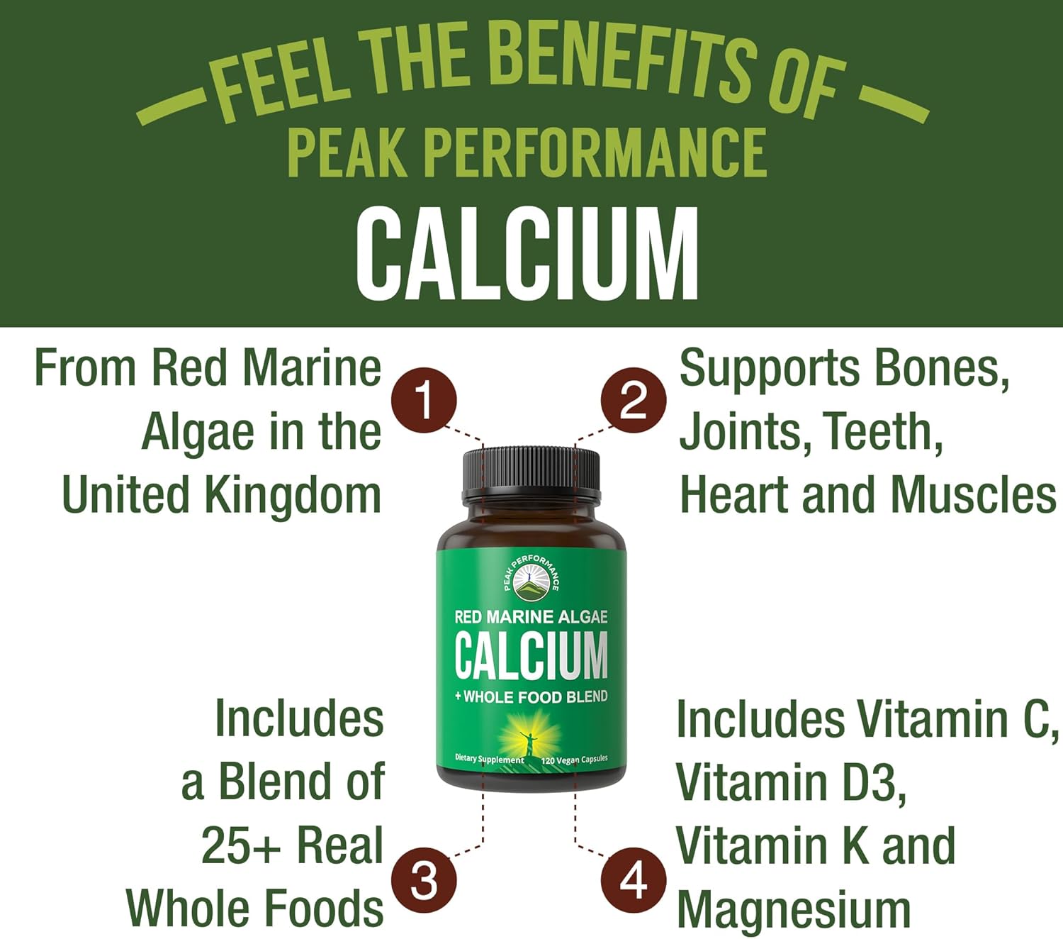 What Do We Stand For • Potency, Quality, And Purity • Proudly Formulated And Manufactured In The Usa With Globally Sourced Ingredients • Strictly Non-Gmo Ingredients And No Artificial Processing We Strive To Make A Difference… • 1-For-1 Donation With The Nonprofit Vitamin Angels • For Every Unit Sold, We Supply A Child At Risk Of Malnutrition With Vitamins • We Have Supplied Vitamins To Over 1,000,000+ Children At Risk Of Malnutrition Don’T Be Fooled Not All Calcium Is The Same! Most Calcium Supplements Use Synthetic, Unnatural Formulas And Fillers That May Increase The Risk Of Artery Calcification. At Peak Performance Our Calcium Is Derived From Wild Red Marine Algae (Lithothamnion) Grown In The United Kingdom. This Gives A Rich And Natural Calcium Resource Necessary For Optimal Bones, Joints, Heart And Muscles. Potency, Quality, And Purity Our Vegan Calcium Rich Plant Based Algae Is Sustainably Harvested From Its Marine Habitat. We Avoid Artificial Processing To Preserve Its Maximum Mineral Nutrients. No Limestone Or Animal Bone. Just Pure, Plant Ingredients! With A Vegetable Blend And Fruit Blend Of Over 25+ Real Whole Foods That Retain Important Enzymes Which Aids In The Digestion Process. Also Includes: Vitamin C, Vitamin D3, Vitamin K And Magnesium. Vegan Formulated - Manufactured Without Gluten, Gmos, Additives, Preservatives, Artificial Colors, Soy, And Dairy. Made Under The Highest Quality Gmp Regulations And Usa Standards. For High Performance Individuals. Not Just For Athletes Who Need To Perform Physically At Their Peak... This Supplement Is Also For Busy Professionals, Moms On-The-Go, Entrepreneurs, And Health Conscious Individuals Who Want To Mentally And Physically Perform At Their Highest Levels Everyday. 1-For-1 Donation - For Every Bottle You Purchase - Peak Performance Through Our Partnership With The Nonprofit Vitamin Angels - Will Supply Vitamins To A Child At Risk Of Malnutrition. You Are Helping Children In Need. So Thank You For Your Contribution