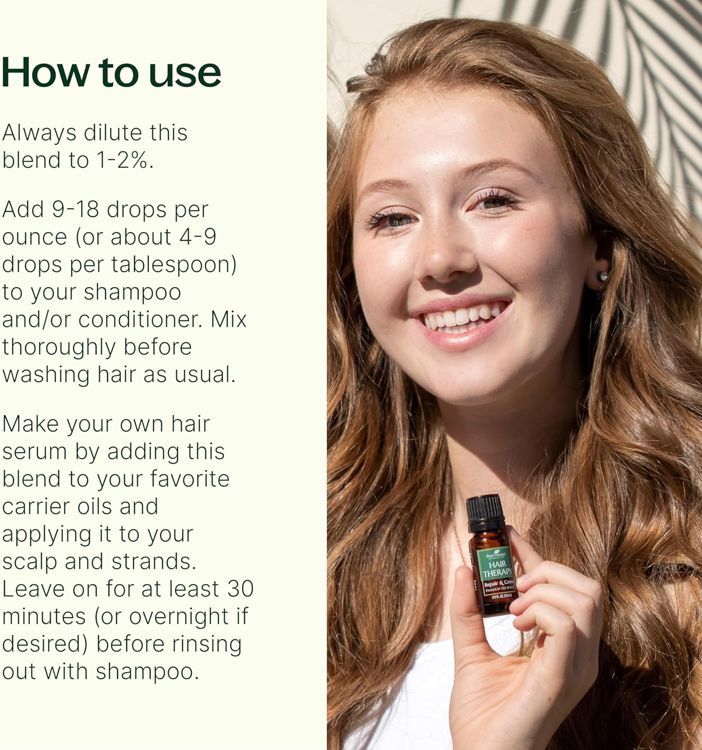 PLANT-BASED HAIR HEALTH: Made with the pure essential oils of Rosemary, Clary Sage, Bergamot, Atlas Cedarwood, Lavandin, and Copaiba, this essential oil blend supports hair health using completely natural ingredients designed to cleanse and nourish hair and scalpFRESH, HERBAL AROMA: The uplifting, herbal aroma is great for everyone! Not too floral and not too herbaceous, this blend is a lovely mix of herbs and flowers that helps rejuvenate your hair and scalp. Together, these essential oils beautify hair by helping promote cleanliness, growth, and hydrationMULTI-USE HAIR THERAPY BLEND: Pure essential oil blend helps restore and protect hair. Add to your shampoo & conditioner to get healthy hair using natural ingredientsHIGH-QUALITY AFFORDABLE ESSENTIAL OILS: At Plant Therapy, our goal is to positively impact the lives of as many people as we possibly can, by selling such a high-quality product at an affordable price. Be confident knowing you are purchasing quality oils at direct-to-consumer pricesCERTIFIED AROMATHERAPISTS ON STAFF: Our customers are our #1 priority and we’d love for you to join the Plant Therapy Family. Our Certified Aromatherapists are happy to help you with all of your essential oil questions. Plus, we offer a risk-free 100% satisfaction guarantee!