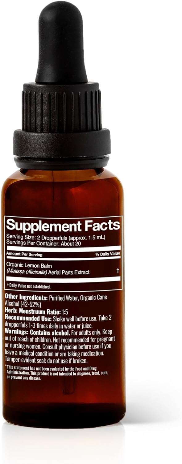 UPLIFTS & BALANCES: Experience the soothing power of Organic Lemon Balm Tincture, a natural choice that promotes relaxation, eases tension, and enhances overall well-being. It also may support digestion, helping to calm upset stomachesMAXIMUM EFFECTIVENESS: Extracted using pure cane alcohol, our tincture offers the broadest range of phytochemicals found within the plant compared to any other solvent. This extraction method ensures rapid absorption into the body and maintains the highest potency and integrity of the extractEASY TO ENJOY: Whether you’re at home, work, or on the go, tinctures effortlessly integrate into your day, allowing you to enjoy the benefits of Lemon Balm without fuss. Simply add a couple dropperfuls into your juice, water, smoothies, or other favorite beverages for a beneficial wellness boost. Each bottle contains about 20 servingsFREE FROM ADDITIVES: This tincture is free from added sugars, flavors, and synthetic preservatives. This effective formulation prioritizes your health by focusing on the beneficial components of Lemon Balm, leaving out anything that doesn't serve your bodyTHE PLANT THERAPY PROMISE: At Plant Therapy, we are committed to providing the highest quality products that positively impact the lives of others. Our Organic Lemon Balm Tincture is rigorously tested and researched, offering maximum potency to support relaxation and rejuvenation