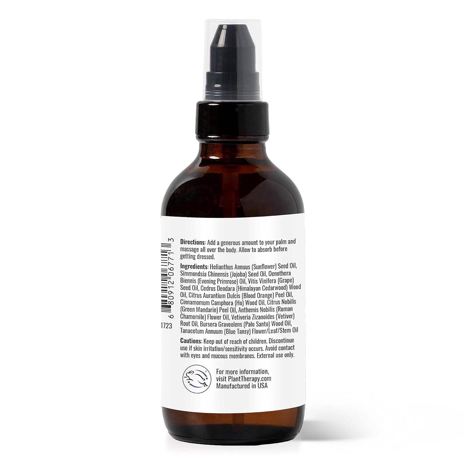 RELAXING & NOURISHING: Deeply moisturize and nourish your skin with a luxurious blend of natural ingredients, including Jojoba Oil, Sunflower Oil, Grapeseed Oil, and Evening Primrose OilEXCELLENT BEFORE BED: Experience a serene sense of relaxation with the soothing scents of Chamomile, Ho Wood, Vetiver, Orange, Blue Tansy, Mandarin, Palo Santo, and Cedarwood essential oilsEASY TO USE: Massage from head-to-toe after showing to help lock in moisture and enjoy the relaxing floral scent. Give your bedtime routine a boost with this natural blend of essential oils that will help calm the mind and promote emotional well-being before sleepTHE HIGHEST QUALITY: At Plant Therapy, our goal is to positively impact the lives of as many people as we possibly can, by selling such a high-quality product at an affordable price. Be confident knowing you are purchasing quality oils, body care, and household at direct-to-consumer pricesCERTIFIED AROMATHERAPISTS ON STAFF: Our Certified Aromatherapists are happy to help you with all of your product questions as well as inquiries regarding body care and essential oils. In addition, we offer a risk-free 100% satisfaction guarantee!