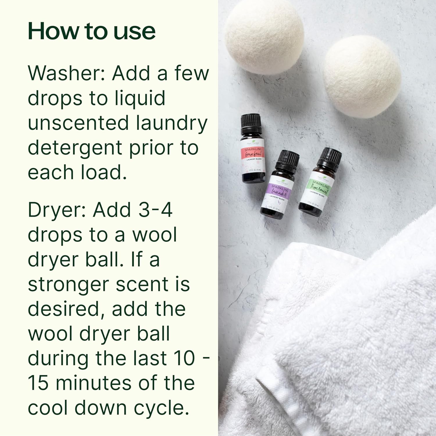 SPARKLING LAUNDRY BLENDS: This three blend set includes Sparkling Lavender, Sparkling Grapefruit and Sparkling Peppermint blendsFORMULATED FOR LAUNDRY: These carefully formulated blends will help your laundry smell fresh and clean. Safe to use in both the washer and dryer, Sparkling Lavender, Sparkling Grapefruit and Sparkling Peppermint naturally freshen and scent your laundry without the use of synthetic or artificial fragrancesSAFE FOR THE WHOLE FAMILY: When used as directed, these blends can safely be used on the whole family's laundry while leaving behind a subtle, fresh aroma on your clothingBATCH SPECIFIC GC-MS REPORTS ON EVERY OIL: Every essential oil in our Sparkling Lavender, Sparkling Grapefruit and Sparkling Peppermint blends from Plant Therapy goes through multiple rounds of testing including organoleptic and multiple rounds of GC-MS testing by a third-party laboratoryPAIR WITH UNSCENTED DETERGENT OR DRYER BALLS: When adding to your wash cycle, add a few drops of your chosen to liquid unscented laundry detergent prior to each load. When using with a dryer, add 3-4 drops to a wool dryer ball and toss the balls into the dryer. Or if a stronger scent is desired, add 3-4 drops to a wool dryer ball during the last 10 - 15 minutes of the cool down cycle