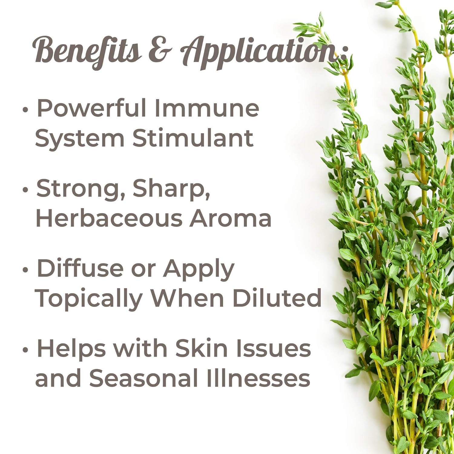 100% Certified Pure Thymus Vulgaris: Our Red Thyme Has A Powerful, Sharp, Warm-Herbaceous Scent. Thyme Thymol Is One Of The Very Best Essential Oils For Supporting The Immune System. Add A Few Drops To A Diffuser To Help Clear Congestion, Battle Sore Throats, Coughs And Colds