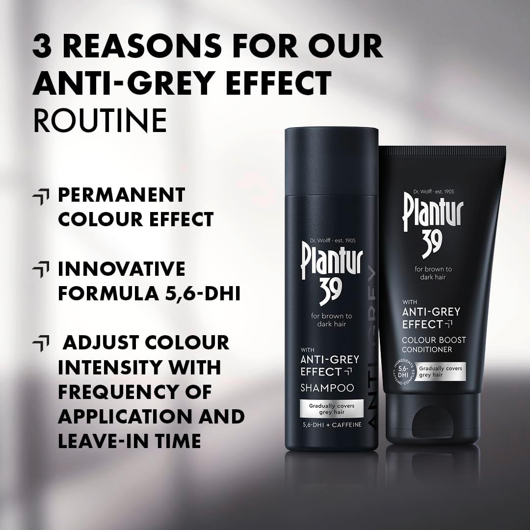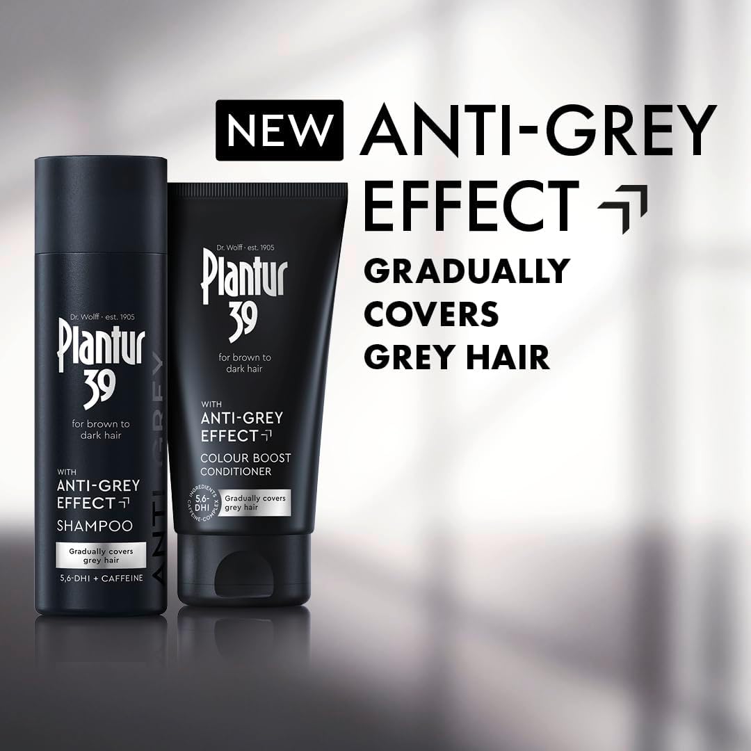 About this item EASY AND EFFECTIVE SOLUTION FOR THOSE FIRST GREY HAIRS: Plantur 39 Anti-Grey Effect offers a gentle solution that gradually covers grey hair, delivering a natural and lasting darkening effect. ACTIVE INGREDIENTS 5,6-DHI attaches permanent colour pigments onto hair without damaging it. With each wash, the colour enhancement becomes more pronounced, seamlessly concealing roots and unwanted grey strands for a rejuvenated look. IDEAL FOR BROWN TO DARK HAIR Plantur 39 Anti-Grey Effect provides strongest results on brown to dark hair. STRENGTHEN AND SUPPORT NATURAL HAIR GROWTH The special Phyto-Caffeine Complex (caffeine plus active botanical substances) supports the natural hair growth, prevents and reduces hair loss. EASY TO USE Gently massage the shampoo into your hair and scalp. Allow it to remain in your hair for 2-5 minutes, follow with a thorough rinse for optimal results. Easily adjust the colour intensity by simply increasing the frequency and duration of application. › See more product details,EASY AND EFFECTIVE SOLUTION FOR THOSE FIRST GREY HAIRS: Plantur 39 Anti-Grey Effect offers a gentle solution that gradually covers grey hair, delivering a natural and lasting darkening effect,ACTIVE INGREDIENTS 5,6-DHI attaches permanent colour pigments onto hair without damaging it. With each wash, the colour enhancement becomes more pronounced, seamlessly concealing roots and unwanted grey strands for a rejuvenated look,IDEAL FOR BROWN TO DARK HAIR Plantur 39 Anti-Grey Effect provides strongest results on brown to dark hair,STRENGTHEN AND SUPPORT NATURAL HAIR GROWTH The special Phyto-Caffeine Complex (caffeine plus active botanical substances) supports the natural hair growth, prevents and reduces hair loss,EASY TO USE Gently massage the shampoo into your hair and scalp. Allow it to remain in your hair for 2-5 minutes, follow with a thorough rinse for optimal results. Easily adjust the colour intensity by simply increasing the frequency and duration of application