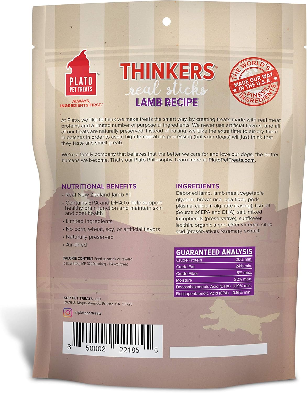 Thinkers Lamb Are Hearty, Meat-Packed Sticks With Added Epa And Dha To Support Healthy Brain Function. Made With Real New Zealand Lamb As The 1St Ingredient, These Treats Are Made With Limited Ingredients, Are Naturally Preserved, And Contain No Artificial Flavors, Corn, Wheat, Or Soy. Because Of Their Large Size, Thinkers Offer Substantial Chewing Satisfaction Or Can Be Broken Into Smaller Pieces To Create Multiple Treats. And We Take The Extra Time To Air-Dry Them In Batches In Our Usa Facility Instead Of Baking Them In Order To Avoid High Temperature Processing (But Your Dog Will Just Think That They Smell And Taste Amazing). It Takes Longer, But We Think Its Worth It. Thinkers Also Come In Salmon, Chicken And Duck